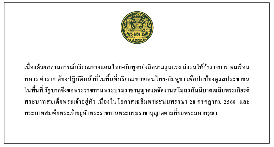 เนื่องด้วยสถานการณ์บริเวณชายแดนไทย-ก้มพูชายังมีความรุนแรง ส่งผลให้ข้าราชการ พลเรือน ทหาร ตำรวจ ต้องปฏิบัติหน้าที่ในพื้นที่บริเวณชายแดนไทย-กัมพูชา เพื่อปกป้องดูแลประชาชน ในพื้นที่ รัฐบาลจึงขอพระราชทานพระบรมราชานุญาตงคจัดงานสโมสรสันนิบาตเฉลิมพระเกียรติ พระบาทสมเด็จพระเจ้าอยู่หัว เนื่องในโอกาสเฉลิมพระชนมพรรษา 28 กรกฎาคม 2568 และ พระบาทสมเด็จพระเจ้าอยู่หัวพระราชทานพระบรมราชานุญาตตามที่ขอพระมหากรุณา