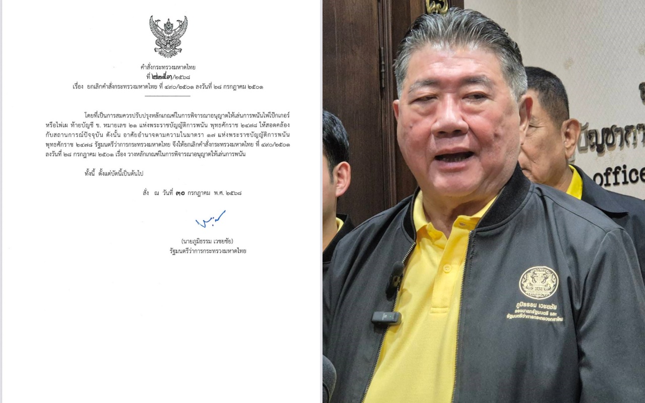 ทั้งนี้ผู้สื่อข่าวรายงานว่า นายภูมิธรรม ได้ลงนามเซ็นคำสั่งกระทรวงมหาดไทย ที่ 2253/2568 เรื่อง ยกเลิกคำสั่งกระทรวงมหาดไทย ที่ 490/2501 ลงวันที่ 28 ก.ค. 2501 โดยมีรายละเอียดที่เป็นการสมควรปรับปรุงหลักเกณฑ์ในการพิจารณาอนุญาตให้เล่นการพนันไพ่โป๊กเกอร์ หรือไพ่เผ ท้ายบัญชี ข. หมายเลข 21 แห่งพระราชบัญญัติการพนัน พุทธศักราช 2478 ให้สอดคล้องกับสถานการณ์ปัจจุบัน ดังนั้น อาศัยอำนาจตามความในมาตรา 17 แห่งพระราชบัญญัติการพนัน พุทธศักราช 2478 รัฐมนตรีว่าการกระทรวงมหาดไทยจึงให้ยกเลิกคำสั่งกระทรวงมหาดไทย ที่ 490/2501 ลงวันที่ 28 ก.ค. 2501 เรื่อง วางหลักเกณฑ์ในการพิจารณาอนุญาตให้เล่นการพนัน ทั้งนี้ ตั้งแต่บัดนี้เป็นต้นไป สั่ง ณ วันที่ 30 ก.ค.2568