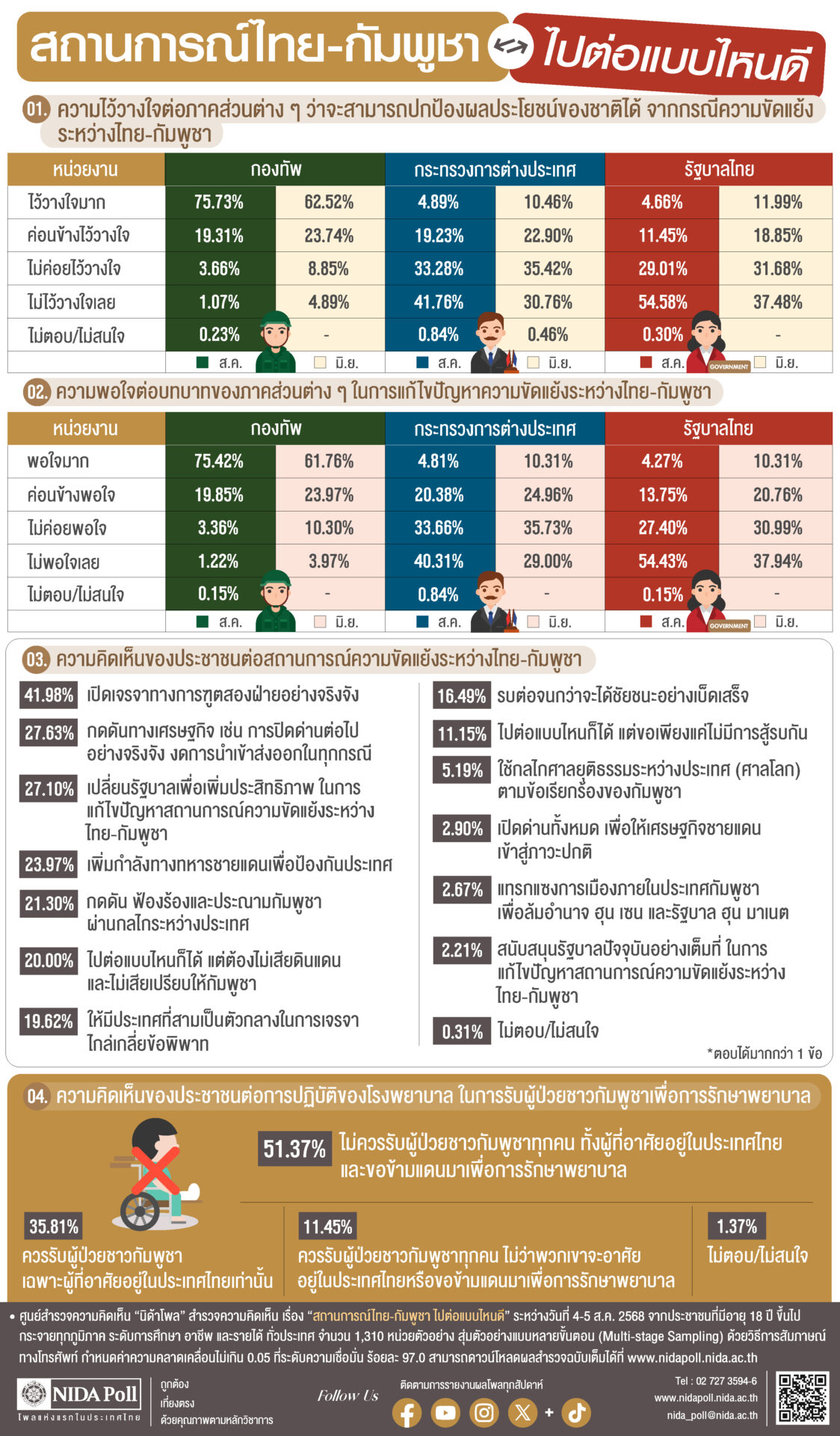 10 ส.ค. 2568 – ศูนย์สำรวจความคิดเห็น “นิด้าโพล” สถาบันบัณฑิตพัฒนบริหารศาสตร์ (นิด้า) เปิดเผยผลการสำรวจเรื่อง “สถานการณ์ไทย-กัมพูชา ไปต่อแบบไหนดี” ทำการสำรวจระหว่างวันที่ 4-5 สิงหาคม 2568 จากประชาชนที่มีอายุ 18 ปีขึ้นไป กระจายทุกภูมิภาค ระดับการศึกษา อาชีพ และรายได้ ทั่วประเทศ รวมจำนวนทั้งสิ้น 1,310 หน่วยตัวอย่าง เกี่ยวกับความไว้วางใจและความพอใจต่อบทบาทของภาคส่วนต่าง ๆ ในการแก้ไขปัญหาความขัดแย้งระหว่างไทย-กัมพูชา การสำรวจอาศัยการสุ่มตัวอย่างโดยใช้ความน่าจะเป็นจากบัญชีรายชื่อฐานข้อมูลตัวอย่างหลัก (Master Sample) ของ “นิด้าโพล” สุ่มตัวอย่างแบบหลายขั้นตอน (Multi-stage Sampling) เก็บข้อมูลด้วยวิธีการสัมภาษณ์ทางโทรศัพท์ โดยกำหนดค่าความคลาดเคลื่อนไม่เกิน 0.05 ที่ระดับความเชื่อมั่น ร้อยละ 97.0