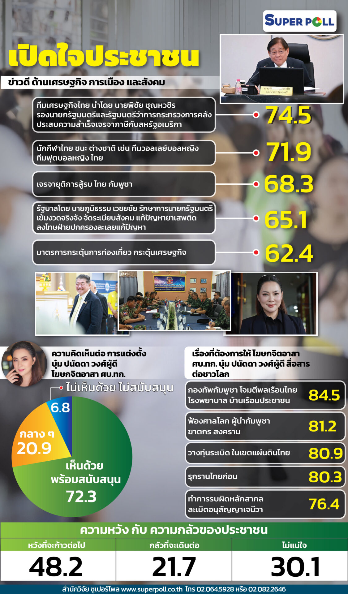 10 ส.ค. 2568 – รายงานของซูเปอร์โพล ระบุว่า จากผลสำรวจ “เปิดใจประชาชน” ของซูเปอร์โพลนี้พบภาพสะท้อนทางสังคม การเมือง และเศรษฐกิจที่น่าสนใจอย่างยิ่ง โดยในมิติข่าวดีด้านเศรษฐกิจ การเมือง และสังคม ประชาชนจำนวนมากให้ความสนใจและพึงพอใจกับเหตุการณ์ที่มีผลเชิงบวกต่อประเทศ ทั้งในด้านความสำเร็จทางเศรษฐกิจ การสร้างชื่อเสียงในเวทีโลก และการแก้ไขปัญหาภายในประเทศ อันดับสูงสุดคือความสำเร็จของทีมเศรษฐกิจไทยที่นำโดยรองนายกรัฐมนตรีและรัฐมนตรีว่าการกระทรวงการคลัง นายพิชัย ชุณหวชิร ในการเจรจาภาษีกับสหรัฐอเมริกา ได้รับการยอมรับจากร้อยละ 74.5 ของตัวอย่างว่าเป็นข่าวดีที่สร้างความเชื่อมั่นต่อเศรษฐกิจไทย