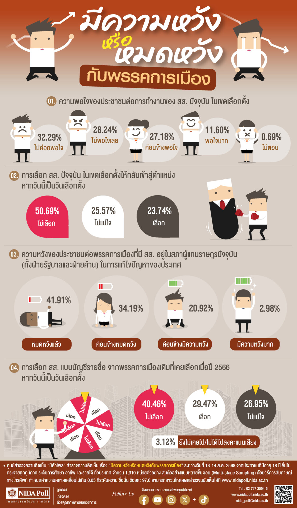 17 ส.ค. 2568 – ศูนย์สำรวจความคิดเห็น “นิด้าโพล” สถาบันบัณฑิตพัฒนบริหารศาสตร์ (นิด้า) เปิดเผยผลการสำรวจเรื่อง “มีความหวังหรือหมดหวังกับพรรคการเมือง” ทำการสำรวจระหว่างวันที่ 13-14 สิงหาคม 2568 จากประชาชนที่มีอายุ 18 ปีขึ้นไป กระจายทุกภูมิภาค ระดับการศึกษา อาชีพ และรายได้ ทั่วประเทศ รวมจำนวนทั้งสิ้น 1,310 หน่วยตัวอย่าง เกี่ยวกับการทำงานของสมาชิกสภาผู้แทนราษฎร (สส.) ปัจจุบัน ในเขตเลือกตั้งการสำรวจอาศัยการสุ่มตัวอย่างโดยใช้ความน่าจะเป็นจากบัญชีรายชื่อฐานข้อมูลตัวอย่างหลัก (Master Sample) ของ “นิด้าโพล” สุ่มตัวอย่างแบบหลายขั้นตอน (Multi-stage Sampling) เก็บข้อมูลด้วยวิธีการสัมภาษณ์ทางโทรศัพท์ โดยกำหนดค่าความคลาดเคลื่อนไม่เกิน 0.05 ที่ระดับความเชื่อมั่น ร้อยละ 97.0