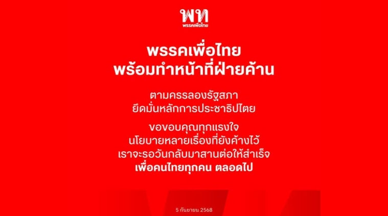 5 กันยายน 2568 – ผู้สื่อข่าวรายงานว่า ภายหลังสมาชิกสภาผู้แทนราษฎร (สส.) ร่วมลงคะแนนโหวตสนับสนุนนายกรัฐมนตรีเสร็จสิ้น เพจเฟซบุ๊กพรรคเพื่อไทย โพสต์ข้อความระบุว่า “พรรคเพื่อไทย พร้อมทำหน้าที่ฝ่ายค้านตามครรลองของรัฐสภา ยึดมั่นหลักการประชาธิปไตย ขอขอบคุณทุกแรงใจ นโยบายหลายเรื่องที่ยังค้างไว้ เราจะรอวันกลับมาสานต่อให้สำเร็จเพื่อคนไทยทุกคน...ตลอดไป"
