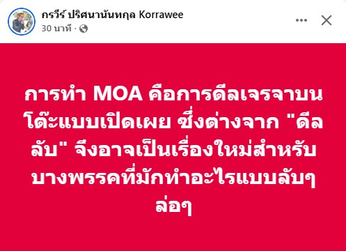 7 ก.ย.2568-นายกรวีร์ ปริศนานันทกุล สส.อ่างทอง พรรคภูมิใจไทย โพสต์เฟซบุ๊กระบุว่า การทำ MOA คือการดีลเจรจาบนโต๊ะแบบเปิดเผย ซึ่งต่างจาก “ดีลลับ” จึงอาจเป็นเรื่องใหม่สำหรับบางพรรคที่มักทำอะไรแบบลับๆล่อๆ