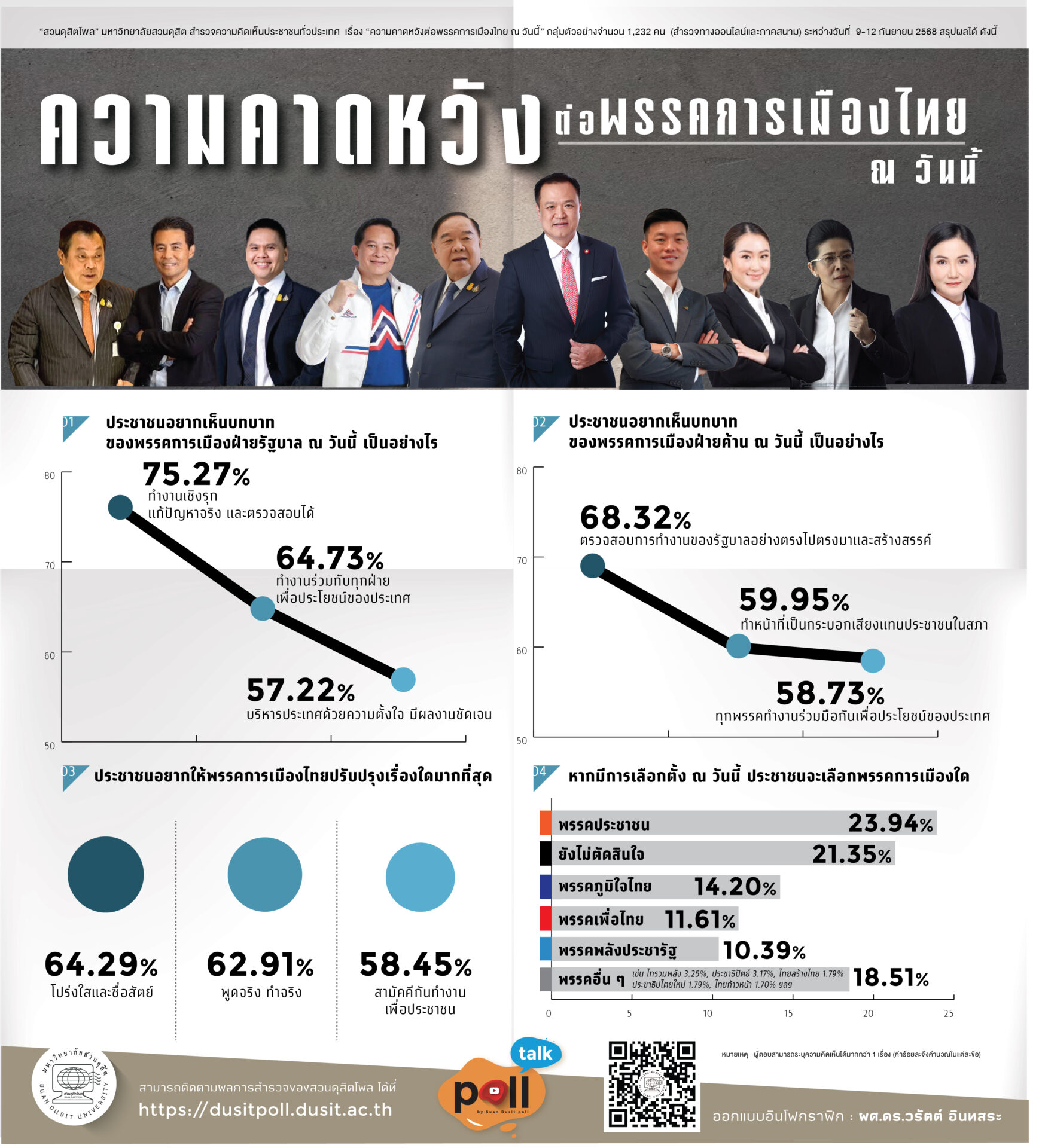 14 ก.ย. 2568 – “สวนดุสิตโพล” มหาวิทยาลัยสวนดุสิต สำรวจความคิดเห็นประชาชนทั่วประเทศ เรื่อง “ความคาดหวังต่อพรรคการเมืองไทย ณ วันนี้” กลุ่มตัวอย่าง จำนวน 1,232 คน (สำรวจทางออนไลน์และภาคสนาม) ระหว่างวันที่ 9-12 กันยายน 2568 พบว่า บทบาทของพรรคการเมืองฝ่ายรัฐบาลที่ประชาชนอยากเห็นมากที่สุด คือ ทำงานเชิงรุก แก้ปัญหาจริง ตรวจสอบได้ ร้อยละ 75.27 ในขณะที่บทบาทของพรรคการเมืองฝ่ายค้านที่อยากเห็น คือ ตรวจสอบการทำงานของรัฐบาลอย่างตรงไปตรงมาและสร้างสรรค์ ร้อยละ 68.32 เรื่องที่อยากให้พรรคการเมืองไทยปรับปรุงมากที่สุด คือ ความโปร่งใสและซื่อสัตย์ ร้อยละ 64.29 หากมีการเลือกตั้ง ณ วันนี้ จะเลือกพรรคประชาชน ร้อยละ 23.94 รองลงมา คือ พรรคภูมิใจไทย ร้อยละ 14.20 และยังไม่ตัดสินใจ ร้อยละ 21.35