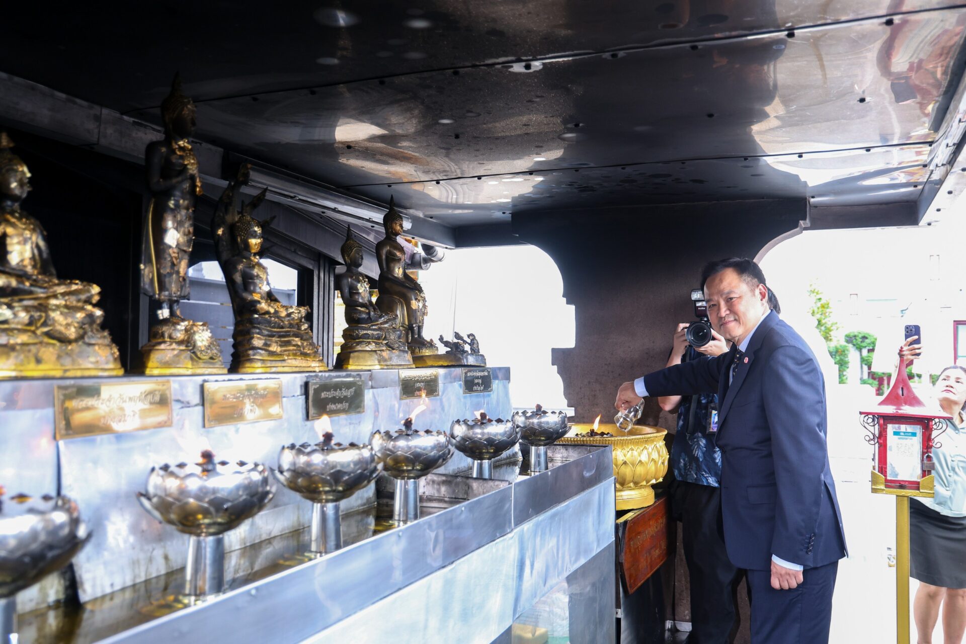 ต่อมานายอนุทิน ได้ผูกผ้าแพร 3 สี ถัดจากนั้น ได้ถวายพวงมาลัยศาลหลักเมือง และสักการะศาลเทพารักษ์ทั้ง 5 พร้อมเติมน้ำมันตะเกียงพระประจำวันเกิด