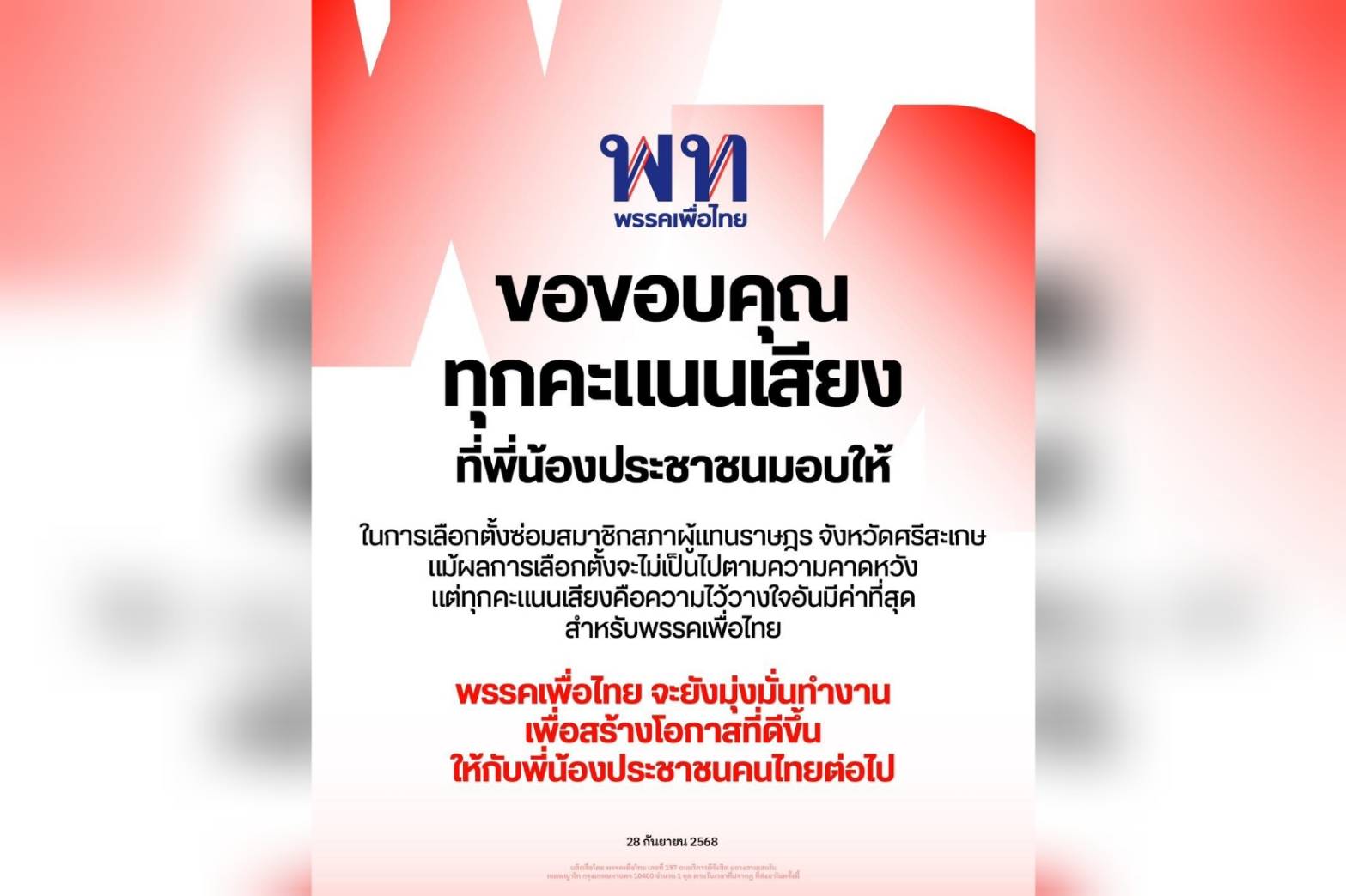 28 ก.ย.2568-เพจพรรคเพื่อไทย โพสต์ข้อความระบุว่า พรรคเพื่อไทย ขอขอบคุณทุกคะแนนเสียงที่พี่น้องประชาชนมอบให้ ในการเลือกตั้งซ่อมสมาชิกสภาผู้แทนราษฎร จังหวัดศรีสะเกษ