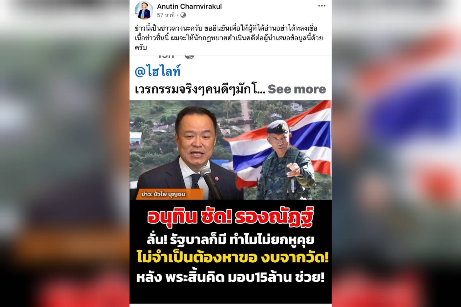 13 ต.ค.2568-นายอนุทิน ชาญวีรกูล นายกรัฐมนตรีและรมว.มหาดไทย โพสต์เฟซบุ๊กระบุว่า ข่าวนี้เป็นข่าวลวงนะครับ ขอยืนยันเพื่อให้ผู้ที่ได้อ่านอย่าได้หลงเชื่อเนื้อข่าวชิ้นนี้ ผมจะให้นักูลกฎหมายดำเนินคดีต่อผู้นำเสนอข้อมูลนี้ด้วยครับ