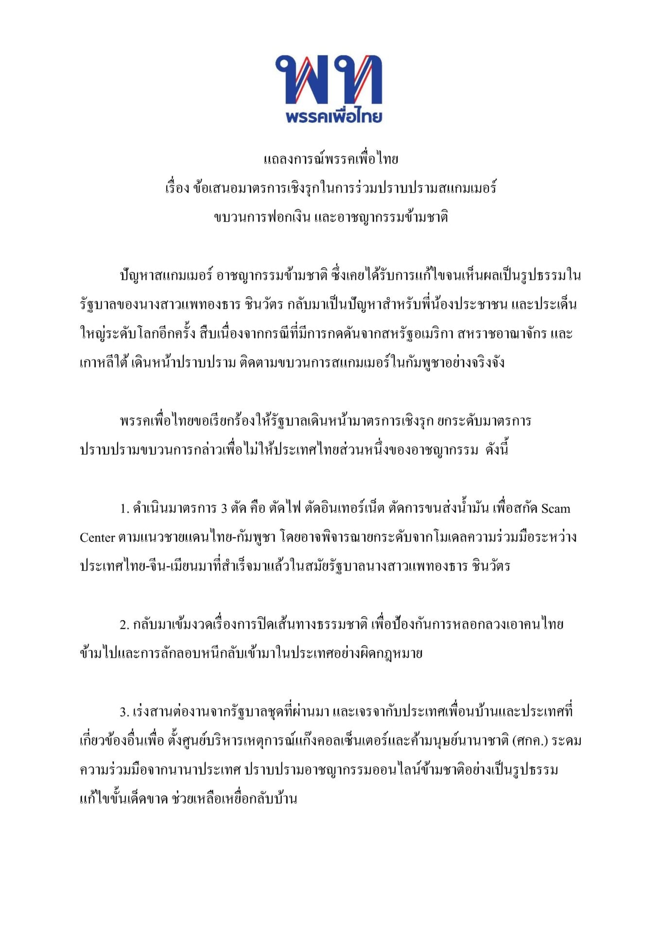 แถลงการณ์พรรคเพื่อไทย เรื่อง ข้อเสนอมาตรการเชิงรุกในการร่วมปราบปรามสแกมเมอร์ ขบวนการฟอกเงิน และอาชญากรรมข้ามชาติ
