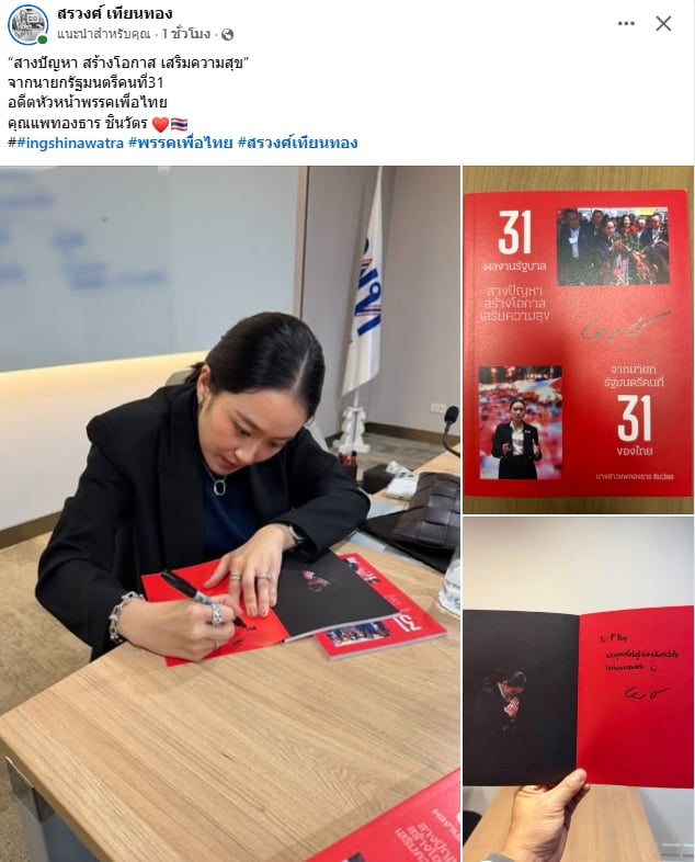 “สรวงศ์ เทียนทอง” เผยภาพ “แพทองธาร ชินวัตร” เซ็นหนังสือ “31 ผลงานรัฐบาล สางปัญหา สร้างโอกาส เสริมความสุข” พร้อมระบุเป็นผลงานจากนายกรัฐมนตรีคนที่ 31 ของไทยและอดีตหัวหน้าพรรคเพื่อไทย