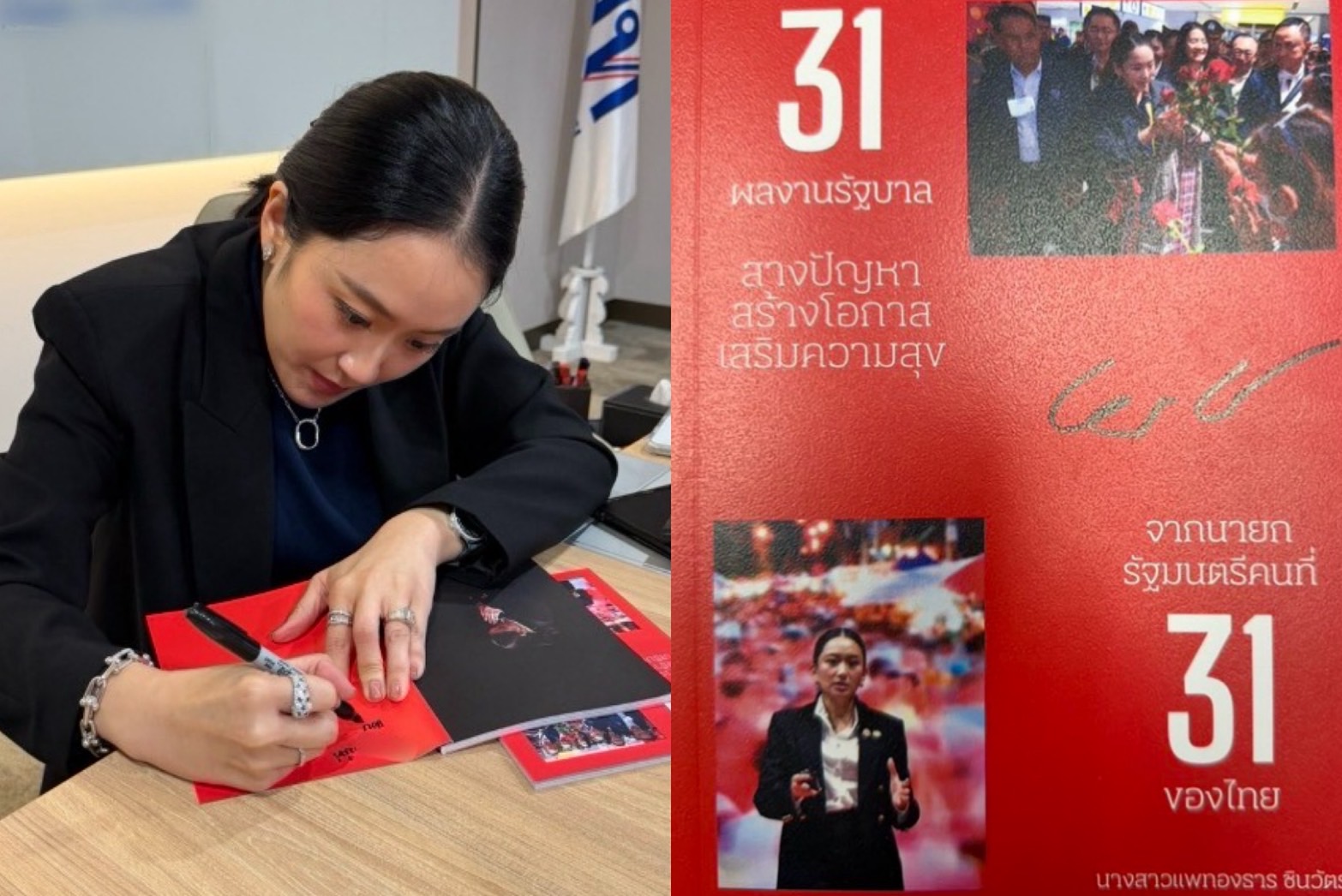 ภาพอีกมุมหนึ่งเผยให้เห็นหน้าปกของหนังสือที่มีข้อความว่า “31 ผลงานรัฐบาล สางปัญหา สร้างโอกาส เสริมความสุข จากนายกรัฐมนตรีคนที่ 31 ของไทย” พร้อมลายเซ็นของแพทองธารและภาพถ่ายขณะกล่าวสุนทรพจน์ต่อหน้าประชาชน