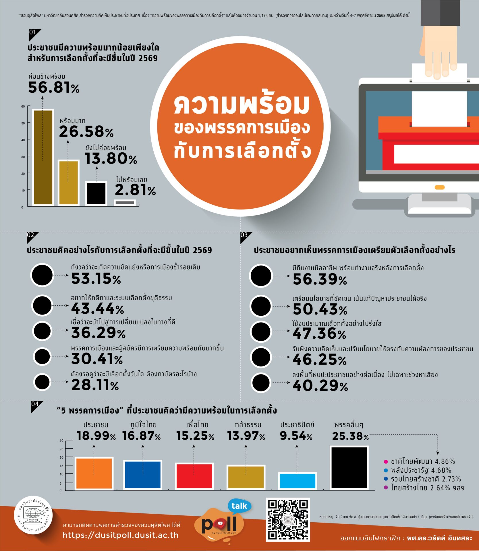 9 พ.ย. 2568 -“สวนดุสิตโพล” มหาวิทยาลัยสวนดุสิต สำรวจความคิดเห็นประชาชนทั่วประเทศ เรื่อง “ความพร้อมของพรรคการเมืองกับการเลือกตั้ง” กลุ่มตัวอย่าง จำนวน 1,174 คน (สำรวจทางออนไลน์และภาคสนาม) ระหว่างวันที่ 4-7 พฤศจิกายน 2568 พบว่า กลุ่มตัวอย่างค่อนข้างพร้อมสำหรับการเลือกตั้งที่จะมีขึ้นในปี 2569 ร้อยละ 56.81 โดยมองว่าการเลือกตั้งใหญ่ที่จะมีขึ้นอาจจะเกิดความขัดแย้งหรือการเมืองซ้ำรอยเดิม ร้อยละ 53.15 ทั้งนี้อยากเห็นพรรคการเมืองเตรียมทีมงานมืออาชีพพร้อมทำงานจริงหลังการเลือกตั้ง ร้อยละ 56.39 โดยพรรคการเมืองที่มองว่ามีความพร้อมรับศึกเลือกตั้งมากที่สุด คือ พรรคประชาชน ร้อยละ 18.99 รองลงมาคือ ภูมิใจไทย ร้อยละ 16.87 และเพื่อไทย ร้อยละ 15.25