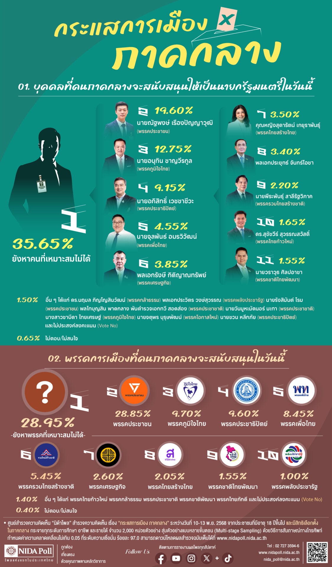 16 พ.ย. 2568- ศูนย์สำรวจความคิดเห็น “นิด้าโพล” สถาบันบัณฑิตพัฒนบริหารศาสตร์ (นิด้า) เปิดเผยผลการสำรวจ เรื่อง “กระแสการเมือง ภาคกลาง” ทำการสำรวจระหว่างวันที่ 10 – 13 พฤศจิกายน 2568 จากประชาชนที่มีอายุ 18 ปีขึ้นไป และมีสิทธิเลือกตั้งในภาคกลาง (จำนวน 17 จังหวัด ประกอบด้วย ชัยนาท พระนครศรีอยุธยา ลพบุรี สระบุรี สิงห์บุรี อ่างทอง นนทบุรี ปทุมธานี นครปฐม สมุทรปราการ กาญจนบุรี ราชบุรี สุพรรณบุรี ประจวบคีรีขันธ์ เพชรบุรี สมุทรสงคราม และสมุทรสาคร อ้างอิงตามประกาศคณะกรรมการนโยบายการบริหารงานจังหวัดและกลุ่มจังหวัดแบบบูรณาการเรื่อง การจัดตั้งกลุ่มจังหวัดและกำหนดจังหวัดที่เป็นศูนย์ปฏิบัติการของกลุ่มจังหวัด (ฉบับที่ 3) (2560, 17 พฤศจิกายน) ราชกิจจานุเบกษา. เล่มที่ 134 [ตอนพิเศษ 281 ง]. หน้า [14]) กระจายทุกระดับการศึกษา อาชีพ และรายได้ รวมจำนวนทั้งสิ้น 2,000 หน่วยตัวอย่าง เกี่ยวกับกระแสการเมือง ภาคกลาง การสำรวจอาศัยการสุ่มตัวอย่างโดยใช้ความน่าจะเป็นจากบัญชีรายชื่อฐานข้อมูลตัวอย่างหลัก (Master Sample) ของ “นิด้าโพล” สุ่มตัวอย่างแบบหลายขั้นตอน (Multi-stage Sampling) เก็บข้อมูลด้วยวิธีการสัมภาษณ์ทางโทรศัพท์ โดยกำหนดค่าความคลาดเคลื่อนไม่เกิน 0.05 ที่ระดับความเชื่อมั่น ร้อยละ 97.0