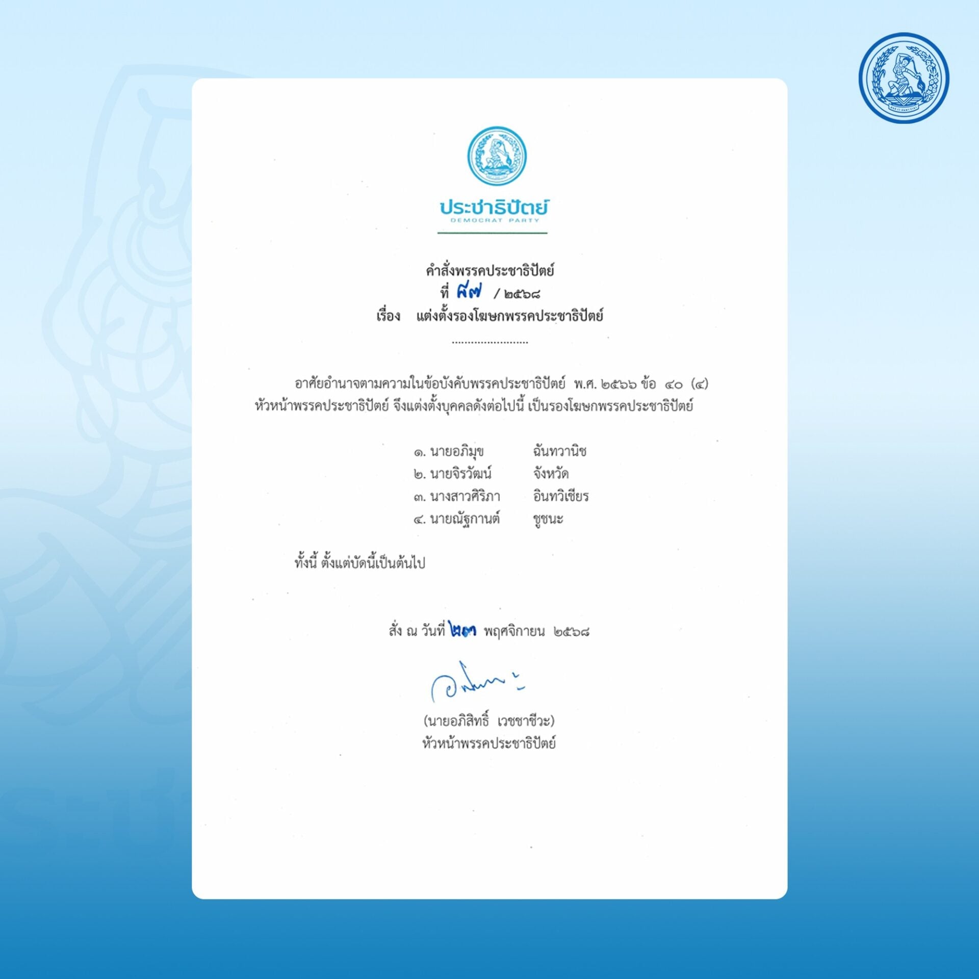 23 พ.ย. 2568 ผู้สื่อข่าวรายงานว่า พรรคประชาธิปัตย์ แต่งตั้งรองโฆษกคนใหม่