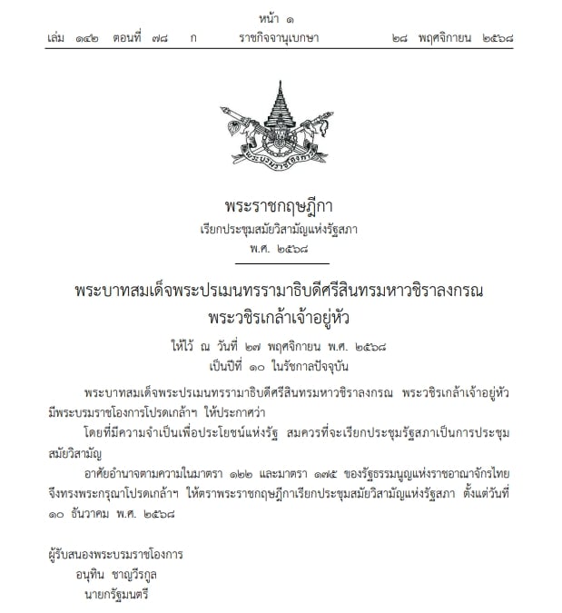 28 พฤศจิกายน 2568 - เว็บไซต์ราชกิจจานุเบกษา เผยแพร่พระราชกฤษฎีกาเรียกประชุมสมัยวิสามัญแห่งรัฐสภา พ.ศ. 2568 พระบาทสมเด็จพระปรเมนทรรามาธิบดีศรีสินทรมหาวชิราลงกรณ พระวชิรเกล้าเจ้าอยู่หัว มีพระบรมราชโองการโปรดเกล้าฯ ให้ประกาศว่า