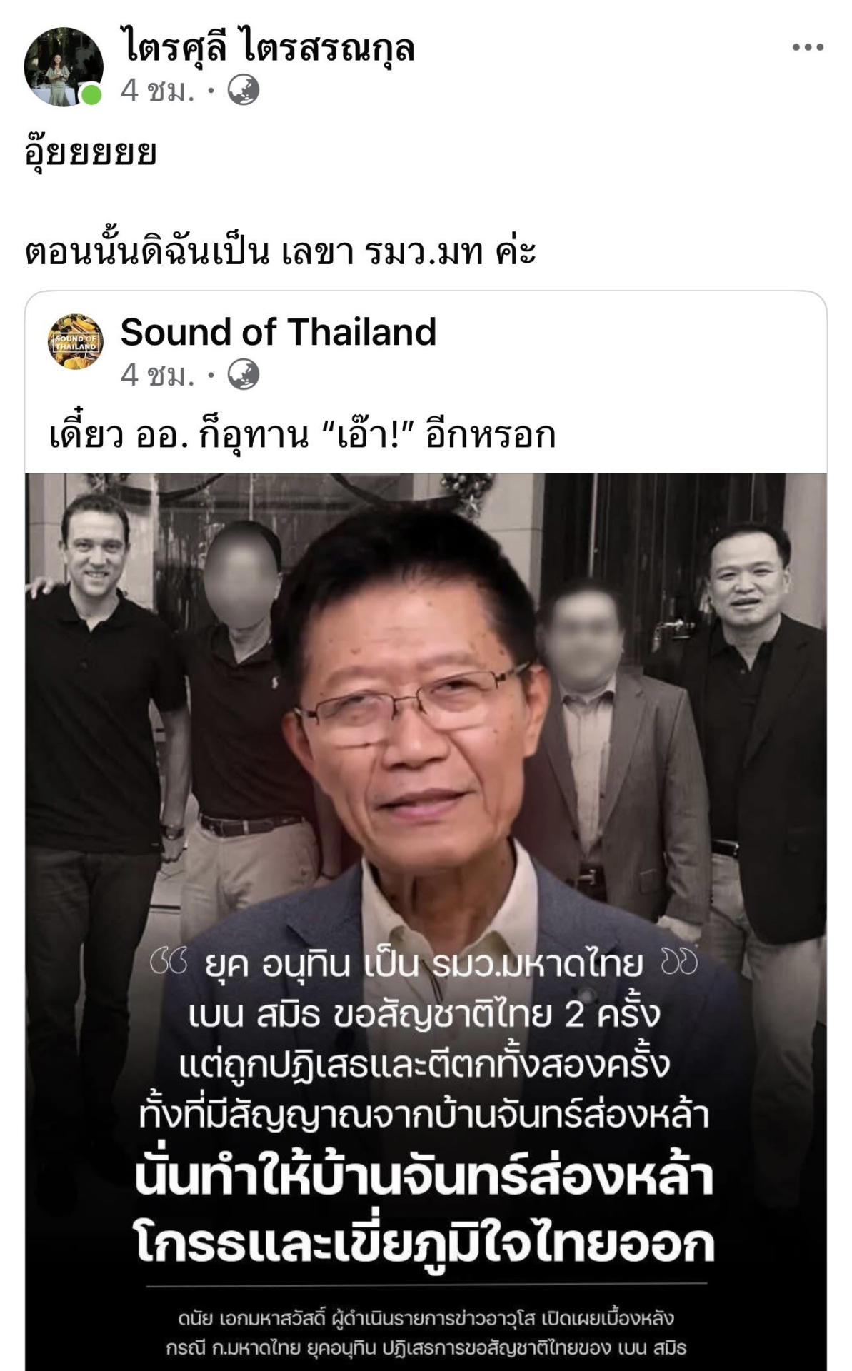 7 ธ.ค. 2568 – น.ส.ไตรศุลี ไตรสรณกุล เลขาธิการนายกรัฐมนตรี โพสต์ เฟสบุ๊คส่วนตัว พร้อมแชร์โฟสต์ข้อความข่าว ที่ นายดนัย เอกมหาสวัสดิ์ หรือ หมาแก่ ผู้ดำเนินรายการข่าวอาวุโส เปิดเผยเบื้องหลังกรณี กระทรวงมหาดไทย ยุคอนุทิน ปฏิเสธการขอสัญชาติไทยของ เบน สมิธ เมื่อวันที่ 5 ธันวาคมที่ผ่านมาว่า “ยุค อนุทิน เป็น รมว.มหาดไทยเบน สมิท ขอสัญชาติไทย 2 ครั้งแต่ถูกปฏิเสธและตีตกทั้งสองครั้ง ทั้งที่มีสัญญาณจากบ้านจันทร์ส่องหล้านั่นทำให้บ้านจันทร์ส่องหล้าโกรธและเขี่ยภูมิใจไทยออก”