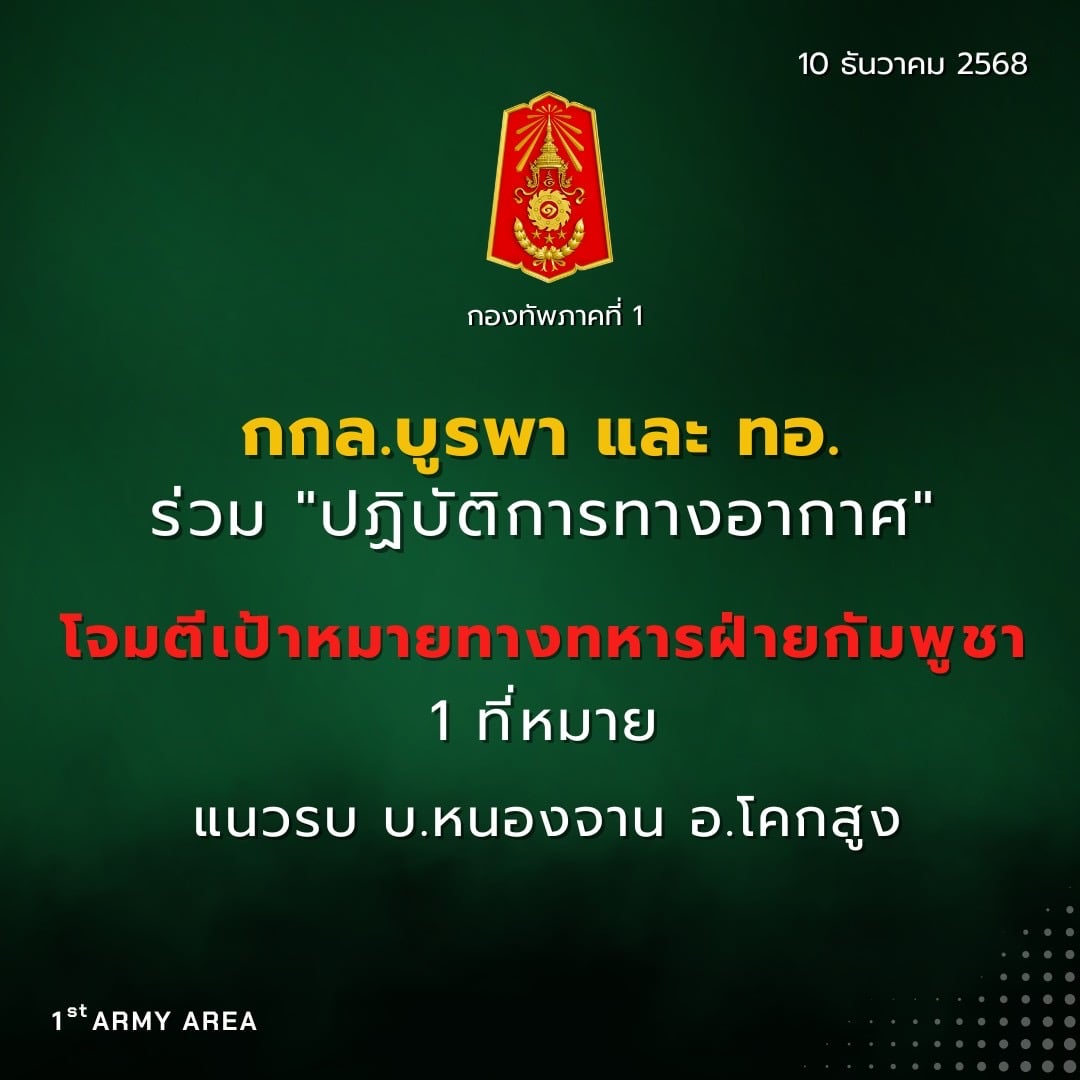 10 ธ.ค.2568 - ศูนย์ปฏิบัติการกองทัพภาคที่ 1 รายงานเพิ่มเติมปฏิบัติการ เมื่อ เวลา 10.00 น. กกล.บูรพา และกองทัพอากาศ (ทอ.) ร่วมกัน "ปฏิบัติการทางอากาศ" โดย F-16 โจมตีเป้าหมายทางทหารฝ่ายกัมพูชา 1 ที่หมายบริเวณชายแดน ตรงข้ามบ้านหนองจาน อ.โคกสูง