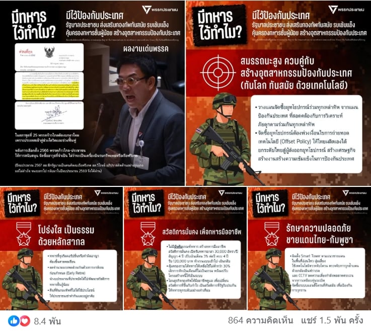 1 มกราคม 2569 - เพจเฟซบุ๊ก พรรคประชาชน ได้ตอบคำถาม รู้ยังทหารมีไว้ทำไม? มีเนื้อหาดังนี้ ทหารมีไว้ป้องกันประเทศ ไม่ใช่เลี้ยงไก่ ตัดหญ้า ซักกางเกงในเมียนาย หรือบริหารสนามกอล์ฟ สนามมวย และสถานีโทรทัศน์