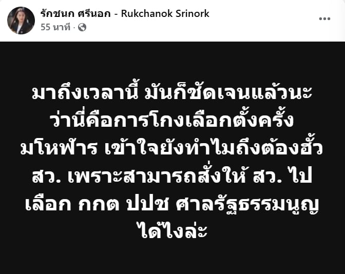 10 ก.พ.2569- ไอซ์ รักชนก ศรีนอก ผู้สมัครบัญชีรายชื่อ พรรคประชาชน โพสต์ข้อความว่า มาถึงเวลานี้ มันก็ชัดเจนแล้วนะ ว่านี่คือการโกงเลือกตั้งครั้งมโหฬาร เข้าใจยังทำไมถึงต้องฮั้ว สว. เพราะสามารถสั่งให้ สว. ไปเลือก กกต ปปช ศาลรัฐธรรมนูญ ได้ไงล่ะ
