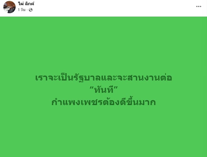 ทางด้านนายไผ่ ลิกค์ เลขาธิการพรรคกล้าธรรม โพสต์ข้อความว่า เราจะเป็นรัฐบาลและจะสานงานต่อ “ทันที” กำพงเพชรต้องดีขึ้นมาก