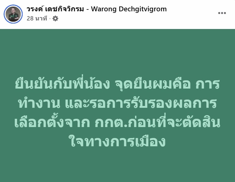 21 กุมภาพันธ์ 2569 - จากกรณีที่มีกระแสข่าว นพ.วรงค์ เดชกิจวิกรม หัวหน้าพรรค และว่าที่ สส.บัญชีรายชื่อ พรรคไทยภักดี จะเข้าร่วมรัฐบาลภูมิใจไทยนั้น ล่าสุด นพ.วรงค์ โพสต์เฟซบุ๊กชี้แจงว่า ยืนยันกับพี่น้อง จุดยืนผมคือ การทำงาน และรอการรับรองผลการเลือกตั้งจาก กกต.ก่อนที่จะตัดสินใจทางการเมือง