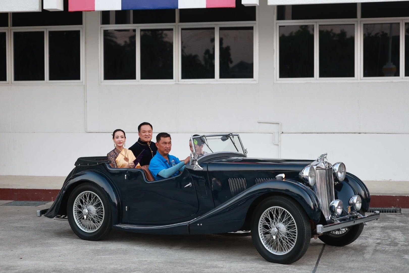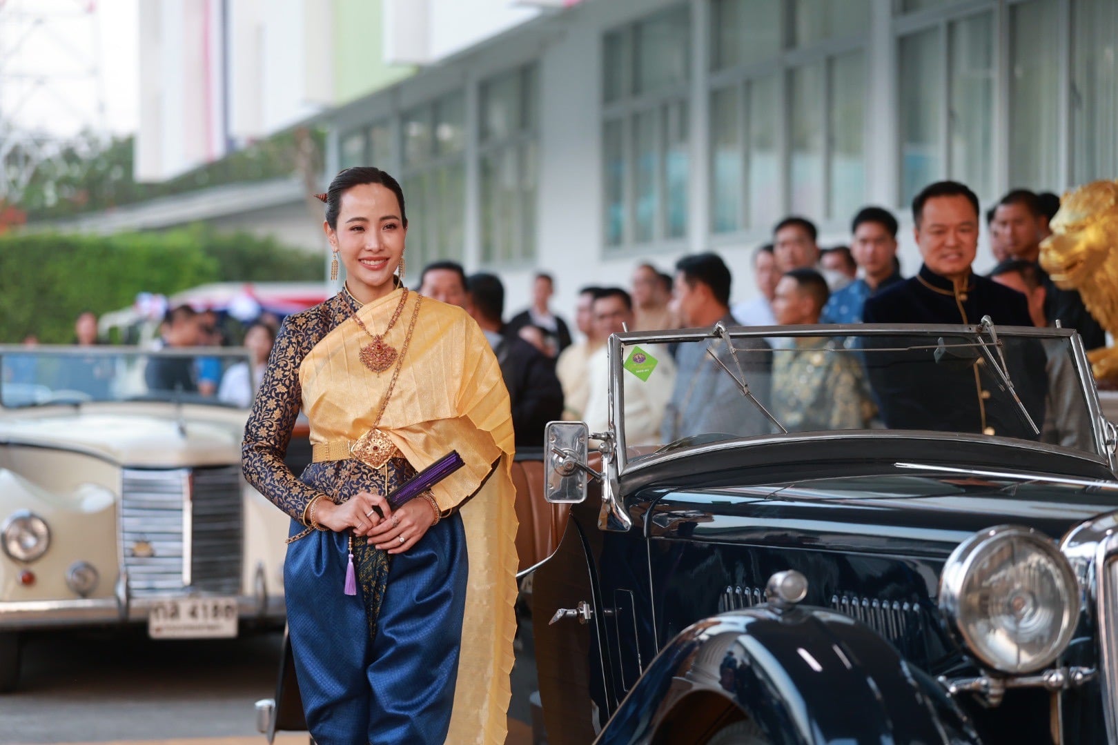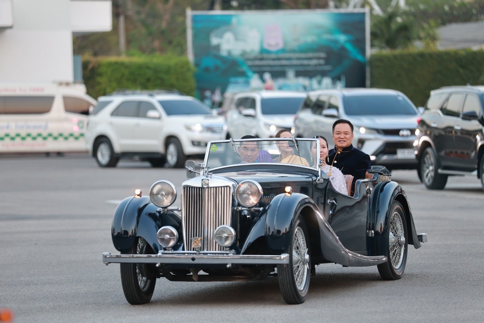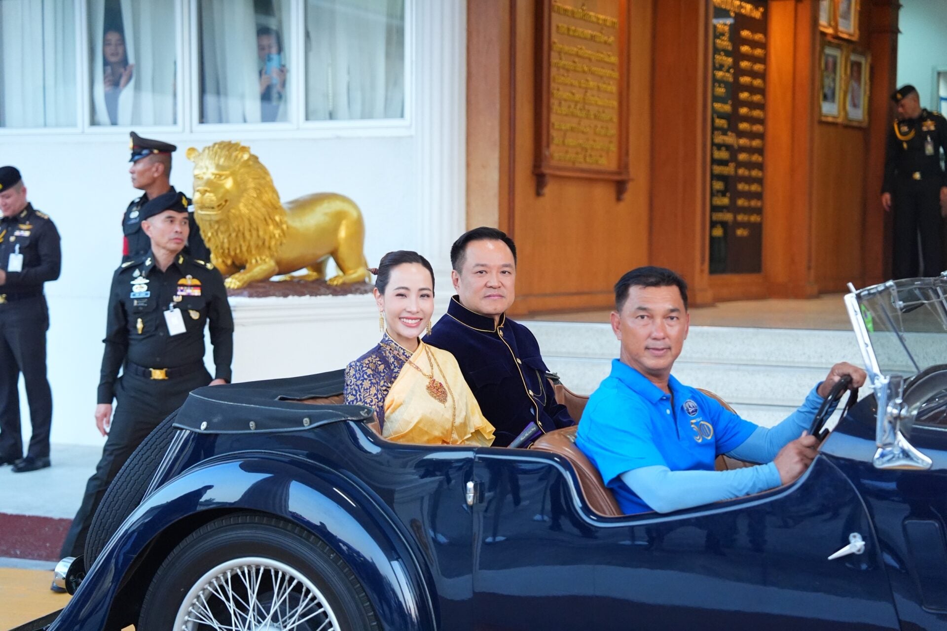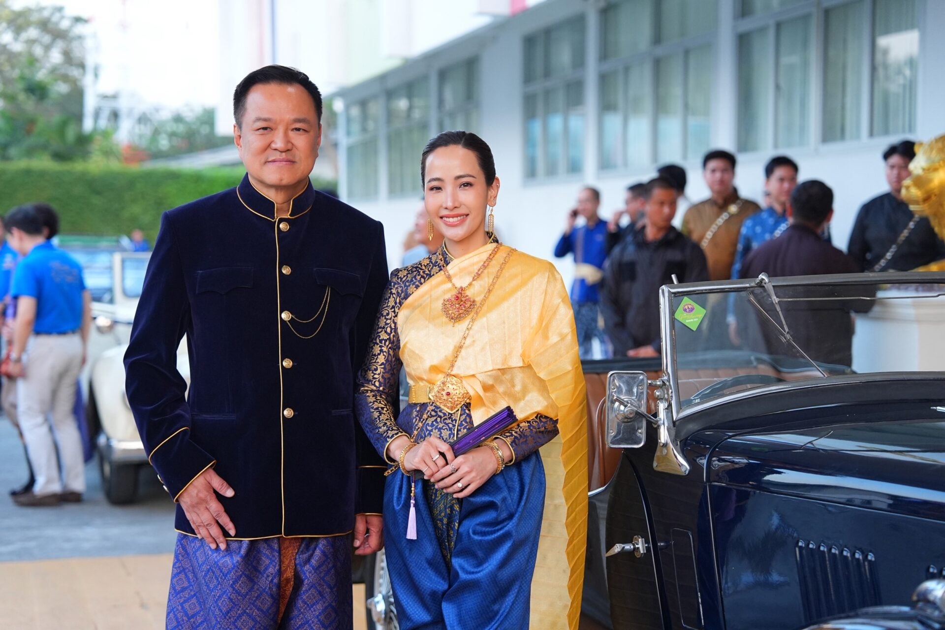 โดยนายอนุทินและภริยา ได้นั่งรถหรูโบราณเข้ามาในงาน สวมชุดไทยเสื้อกำมะหยี่สีน้ำเงินขลิบดิ้นทอง นุ่งโจงกระเบนสีม่วง ขณะที่น.ส.ธนนนท์ สวมชุดไทยห่มสไบ นุ่งโจงกระเบนสีน้ำเงิน โดยมี น.ส.วิสุดา วิเชียรศิลป์ ว่าที่สส.กาญจนบุรี บุตรสาวนายศักดิ์ดา วิเชียรศิลป์ รมช.มหาดไทย นั่งมาด้วย โดยนายอนุทิน ระบุว่า ให้มาเป็นบอดี้การ์ด