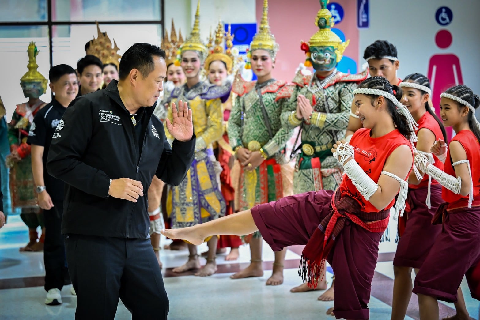 เมื่อเวลา 10.55 น. วันที่ 1 มี.ค. นายอนุทิน ชาญวีรกูล นายกรัฐมนตรี และรัฐมนตรีว่าการกระทรวงมหาดไทย พร้อมคณะ เดินทางถึงท่าอากาศยานบุรีรัมย์ โดยมีผู้ว่าราชการจังหวัดบุรีรัมย์ ผู้บังคับการตำรวจภูธรจังหวัดบุรีรัมย์ อาสาสมัครรักษาดินแดน กระทรวงมหาดไทย เจ้าหน้าที่สาธารณสุขจังหวัด ให้การต้อนรับ นอกจากนี้ ยังมีสำนักงานวัฒนธรรมจังหวัดบุรีรัมย์ ได้จัดการแสดงวัฒนธรรมต้อนรับ ประกอบด้วย รำไทยนาฏศิลป์ โขน และมวยไทย ช่วงหนึ่งนายกฯได้แวะทักทายเยาวชนที่จัดแสดงมวยไทย พร้อมกับหยอกให้เตะมาที่ก้านคอตนเอง ซึ่งนายกฯได้ตั้งการ์ดรอรับ ระหว่างนี้มีเยาวชนอีกคนได้หยอกกับเพื่อนว่า ให้จัดหนักเลย ทำให้นายกฯถึงกับหัวเราะ ทั้งนี้ เยาวชนดังกล่าวได้เตะไปเพียงระดับขาของนายกฯเท่านั้น และไม่ได้มีการโดนตัวแต่อย่างใด ก่อนที่จะยกมือไหว้นายกฯ