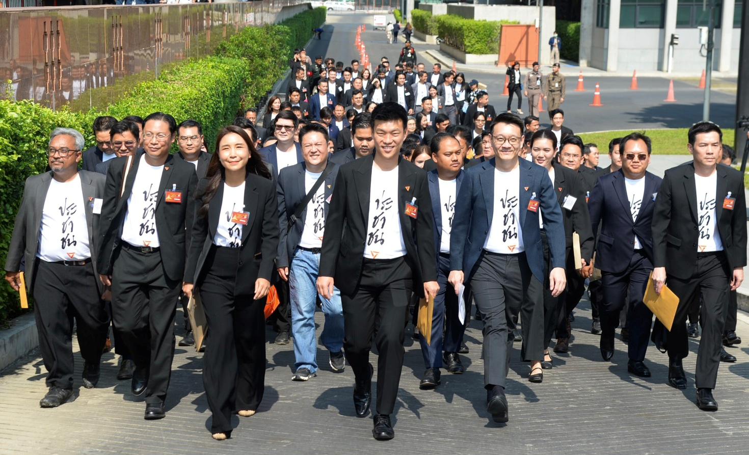9 มี.ค. 2569 – เมื่อเวลา 10.10 น. ที่รัฐสภา พรรคประชาชน นำโดย นายณัฐพงษ์ เรืองปัญญาวุฒิ สส.บัญชีรายชื่อและหัวหน้าพรรรค นำสส. ของพรรคเข้ารายงานตัว เดินทางโดยรถบัสจำนวน 3 คัน ทั้งหมดใส่เสื้อยืดสีขาวสกรีนคำว่า ประชาชนพร้อมกับใส่สูททับติดเข็มกลัดโลโก้ของพรรค บริเวณด้านหน้าอาคารรัฐสภามีมวลชนมาคอยต้อนรับมอบดอกไม้ให้