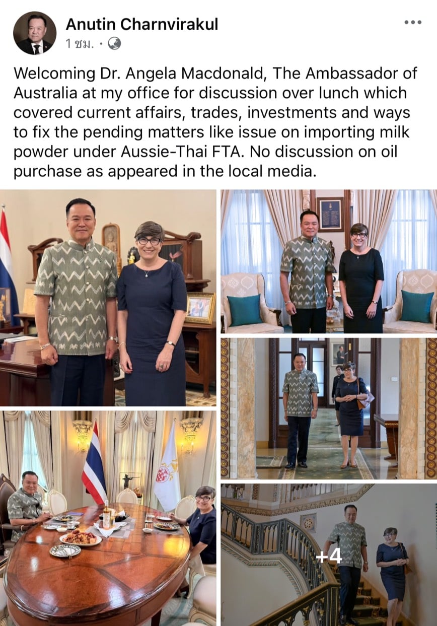 'อนุทิน' โพสต์คุย 'ทูตออสเตรเลีย' ด้านการค้า-การลงทุน -ปัญหานำเข้านมผง ปัดถกซื้อน้ำมัน