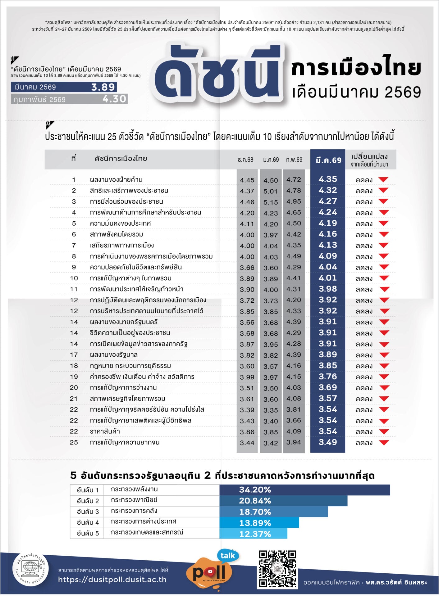 29 มีนาคม 2569 – สวนดุสิตโพล มหาวิทยาลัยสวนดุสิต สำรวจความคิดเห็นประชาชนทั่วประเทศ เรื่อง “ดัชนีการเมืองไทย ประจำเดือนมีนาคม 2569” กลุ่มตัวอย่าง จำนวน 2,181 คน (สำรวจทางออนไลน์และภาคสนาม) ระหว่างวันที่ 24-27 มีนาคม 2569 พบว่า กลุ่มตัวอย่างให้คะแนนภาพรวมดัชนีการเมืองไทยประจำเดือนมีนาคม เฉลี่ย 3.89 คะแนน ลดลงจากเดือนกุมภาพันธ์ 2569 ที่ได้ 4.30 คะแนน ตัวชี้วัดที่ได้คะแนนสูงสุด คือ ผลงานของฝ่ายค้าน ได้คะแนนเฉลี่ย 4.35 คะแนน ตัวชี้วัดที่ได้คะแนนต่ำสุด คือการแก้ปัญหาความยากจน ได้คะแนนเฉลี่ย 3.49 คะแนน ทั้งนี้กระทรวงที่ประชาชนคาดหวังการทำงานมากที่สุด คือ กระทรวงพลังงาน ร้อยละ 34.20 รองลงมาคือ กระทรวงพาณิชย์ ร้อยละ 20.84