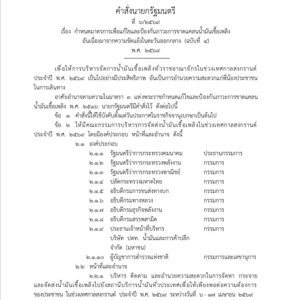 1 เมษายน 2569 - เว็บไซต์ราชกิจจานุเบกษาเผยแพร่คําสั่งนายกรัฐมนตรีที่ 6/2569 เรื่องกำหนดมาตรการเพื่อแก้ไข และป้องกันภาวะการขาดแคลนน้ำมันเชื้อเพลิงอันเนื่องมาจากความขัดแย้งในตะวันออกกลาง (ฉบับที่ 4) พ.ศ.2569 โดยให้มีคณะกรรมการบริหารการจัดส่งน้ํามันเชื้อเพลิง ในช่วงเทศกาลสงกรานต์ พ.ศ.2569 ให้เป็นไปอย่างมีประสิทธิภาพ เพื่ออํานวยความสะดวกประชาชนในการเดินทางช่วงสงกรานต์