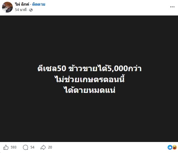5 เมษายน 2569 – นายไผ่ ลิกค์ สส.กำแพงเพชร เลขาธิการพรรคกล้าธรรม โพสต์เฟซบุ๊กส่วนตัวระบุว่า ดีเซล 50 ข้าวขายได้ 5,000 กว่า ไม่ช่วยเกษตรกรตอนนี้ ได้ตายหมดแน่ เปิดสภาจะให้คนของพรรคพูดเรื่องนี้ ฝากรัฐบาลและท่านศุภจีแก้ไขหน่อยครับ