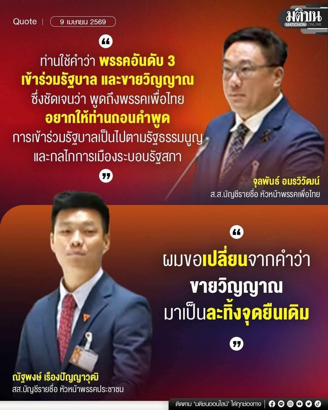 เพิ่งเห็นคลิปหัวหน้าเท้งอภิปรายว่าการที่พรรคเพื่อไทยร่วมรัฐบาลกับภูมิใจไทยคือการขายวิญญาณ
