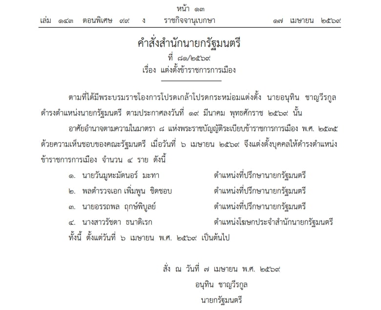18 เมษายน 2569 - เว็บไซต์ราชกิจจานุเบกษา เผยแพร่คำสั่งสำนักนายกรัฐมนตรี ที่ ๘๑/๒๕๖๙ เรื่อง แต่งตั้งข้าราชการการเมือง