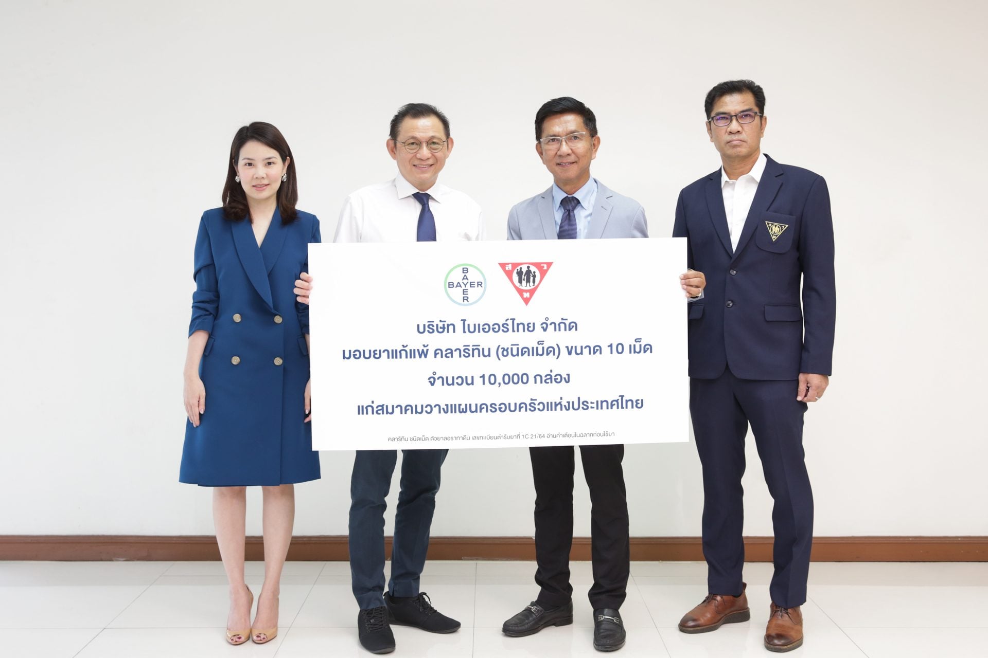 นายไท เป็ง มัค ผู้จัดการทั่วไปกลุ่มธุรกิจคอนซูเมอร์เฮลธ์ บริษัท ไบเออร์ไทย จำกัด นางสาวศราวรรณ รัตนเดช ผู้จัดการฝ่ายการตลาด กลุ่มธุรกิจคอนซูเมอร์เฮลธ์ มอบผลิตภัณฑ์คลาริทิน (ชนิดเม็ด) จำนวน 10,000 กล่อง ให้กับ รศ.ดร.ฤๅเดช เกิดวิชัย นายกสมาคมวางแผนครอบครัวแห่งประเทศไทย นายสมเจตน์ ศรีกนก ผู้อำนวยการสมาคมวางแผนครอบครัวแห่งประเทศไทย เพื่อช่วยเหลือผู้ป่วยภายใต้การดำเนินโครงการและกิจกรรมเพื่อสาธารณสุขของสมาคมฯ ซึ่งนับเป็นอีกหนึ่งกิจกรรมเพื่อสังคมของไบเออร์ไทย เนื่องในโอกาสครบรอบ 60 ปีของการดำเนินธุรกิจในประเทศไทย ปี 2565