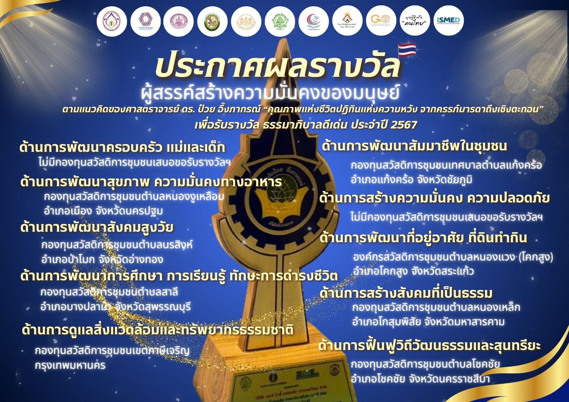 รางวัลองค์กรสวัสดิการชุมชน ผู้สร้างสรรค์ความมั่นคงของมนุษย์ ตามแนวคิดของศาสตราจารย์ ดร.ป๋วย อึ๊งภากรณ์ “คุณภาพชีวิตปฏิทินแห่งความหวัง จากครรภ์มารดาถึงเชิงตะกอน” จัดประกวดปีนี้ ได้เฟ้นหากองทุนสวัสดิการชุมชนที่มีผลงานดีเด่นในด้านต่างๆ จำนวน 10 ด้าน จากทั่วประเทศ