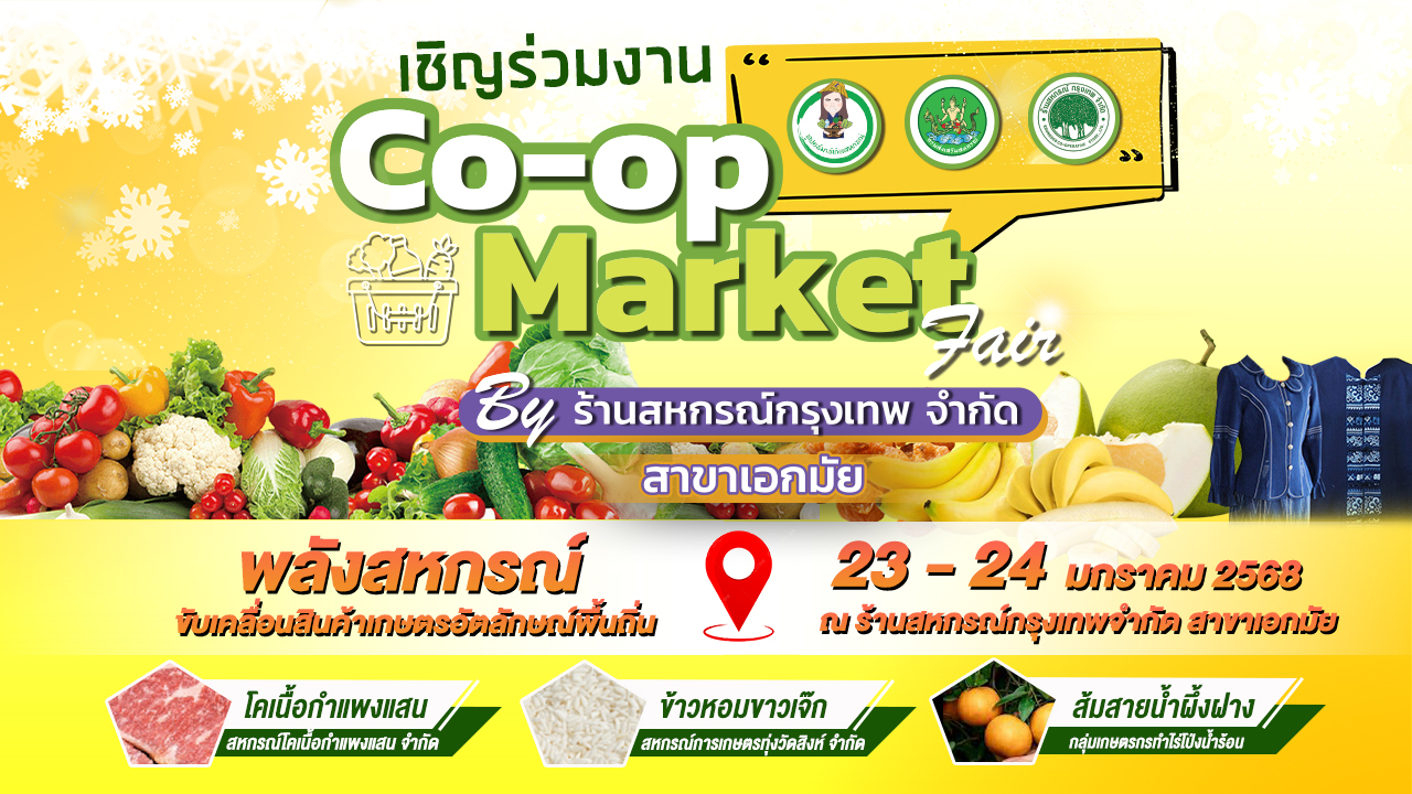 กรมส่งเสริมสหกรณ์ เชิญชวนเลือกซื้อสินค้าดีมีคุณภาพผลผลิตจากสหกรณ์ทั่วประเทศ ในงาน “Co-op Market Fair พลังสหกรณ์ ขับเคลื่อนสินค้าเกษตรอัตลักษณ์พื้นถิ่น By ร้านสหกรณ์กรุงเทพ จำกัด สาขาเอกมัย” พบกับสินค้ามากมายให้คนกรุงเทพได้ซื้อสินค้าดีมีคุณภาพจากเกษตรกรผู้ผลิตโดยตรง พร้อมกระตุ้นการจับจ่าย และสร้างรายได้ให้เกษตรกร พบกันระหว่างวันที่ 23 – 24 มกราคม 2568 ตั้งแต่เวลา 08.00 – 19.00 น. ณ บริเวณร้านสหกรณ์กรุงเทพ จำกัด สาขาเอกมัย เขตวัฒนา กรุงเทพมหานคร