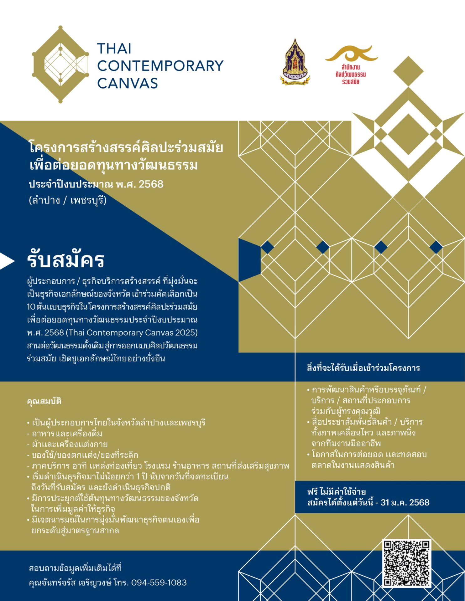 โอกาสเพิ่มศักยภาพให้ธุรกิจของคุณภายใต้คำแนะนำ และทำงานร่วมกับผู้เชี่ยวชาญ/ศิลปิน/นักออกแบบระดับประเทศ ในโครงการสร้างสรรค์ศิลปะร่วมสมัยเพื่อต่อยอดทุนทางวัฒนธรรม (THAI CONTEMPORARY CANVAS 2025)
