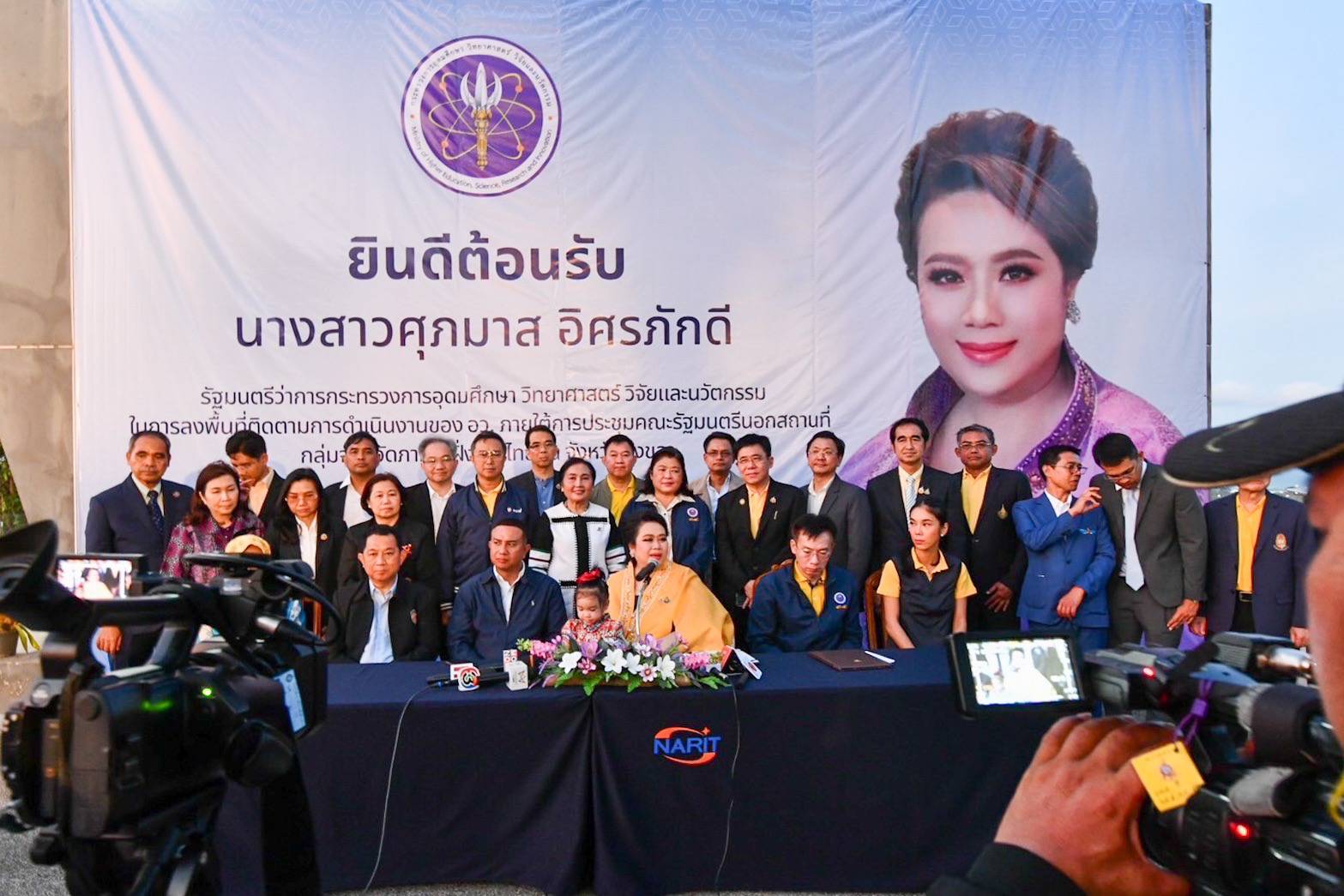 เมื่อวันที่ 17 ก.พ.68 น.ส.ศุภมาส อิศรภักดี รมว.การอุดมศึกษา วิทยาศาสตร์ วิจัยและนวัตกรรม (อว.) พร้อมด้วย พญ.เพชรดาว โต๊ะมีนา ที่ปรึกษา รมว.อว. น.ส.สุชาดา ซาง แทนทรัพย์ เลขานุการ รมว.อว. ศ.ดร.ศุภชัย ปทุมนากุล ปลัดกระทรวง อว. และผู้บริหารกระทรวง อว. ลงพื้นที่ติดตามการดำเนินงานของกระทรวง อว. ภายใต้การประชุมคณะรัฐมนตรี (ครม.) อย่างเป็นทางการนอกสถานที่กลุ่มจังหวัดภาคใต้ฝั่งอ่าวไทย (สงขลา ชุมพร สุราษฎร์ธานี นครศรีธรรมราช พัทลุง) ที่หอดูดาวเฉลิมพระเกียรติ 7 รอบ พระชนมพรรษา สงขลา จ.สงขลา โดยบรรยากาศเป็นไปอย่างคึกคัก แต่ละหน่วยงานในสังกัดกระทรวง อว. ได้นำนิทรรศการและผลผลิตทางวิทยาศาสตร์ เทคโนโลยีและนวัตกรรมมาจัดแสดงอย่างคับคั่ง