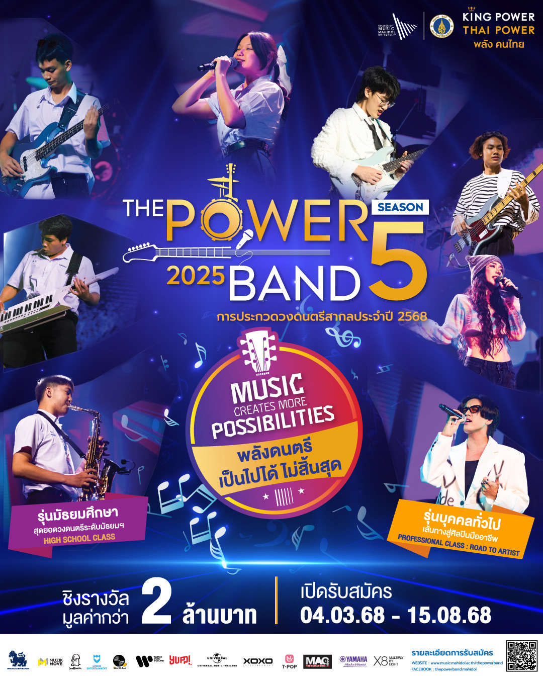 พร้อมด้วยพันธมิตร 8 ค่ายเพลงชั้นนำ สร้างปรากฏการณ์ปั้นฝันศิลปินหน้าใหม่แจ้งเกิดผ่านการประกวด THE POWER BAND 2025 SEASON 5 การประกวดวงดนตรีสากลประจำปี 2568 ภายใต้คอนเซปต์ MUSIC CREATES MORE POSSIBILITIES พลังดนตรี เป็นไปได้ ไม่สิ้นสุด ชิงรางวัลมูลค่ากว่า 2,000,000 บาท พร้อมโอกาสในการทำซิงเกิลกับโปรดิวเซอร์มืออาชีพ และร่วมแสดงในเทศกาลดนตรีระดับประเทศ โดยจะจัดงานแถลงข่าวในวันอังคารที่ 4 มีนาคมนี้ เวลา 14.00 น. ณ คราวน์ เอเทรียม คิง เพาเวอร์ รางน้ำ