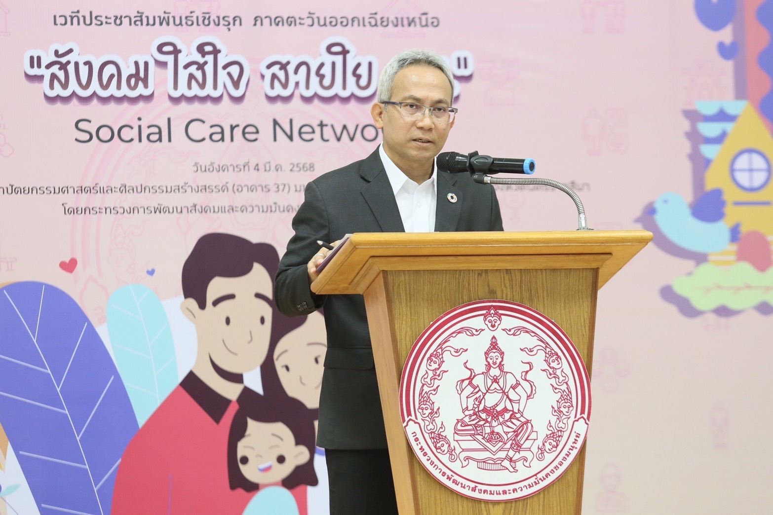 เมื่อวันที่ 4 มีนาคม 2568 ที่มหาวิทยาลัยเทคโนโลยีราชมงคลอีสาน อำเภอเมือง จังหวัดนครราชสีมา นายอนุกูล ปีดแก้ว ปลัดกระทรวงการพัฒนาสังคมและความมั่นคงของมนุษย์ (ปลัด พม.) เป็นประธานในพิธีเปิดงานเวทีประชาสัมพันธ์เชิงรุกภาคตะวันออกเฉียงเหนือ “สังคม ใส่ใจ สายใย พม.“ (Social Care Networks) จัดโดยสำนักงานส่งเสริมและสนับสนุนวิชาการ (สสว.) 4, 5 และ 6 เพื่อเป็นการสื่อสารและประชาสัมพันธ์ภารกิจการพัฒนาคุณภาพชีวิตประชาชนทุกกลุ่มเป้าหมาย ของกระทรวงการพัฒนาสังคมและความมั่นคงของมนุษย์ในระดับพื้นที่ ทั้งนี้ ภายในงานประกอบด้วยกิจกรรมสำคัญ อาทิ 1) นิทรรศการ พม. มีอะไรมากกว่าที่คุมคิด (Open House พม. หนึ่งเดียว) นำเสนอบทบาท ภารกิจ และผลงาน ของหน่วยงานทีม พม. หนึ่งเดียวจังหวัด ในเขตพื้นที่ สสว. 4, 5 และ 6 2) กิจกรรม “โอบอุ้ม ห่วงใย ใส่ใจ ประชาชน” โดย ศูนย์เร่งรัดจัดการสวัสดิภาพประชาชน (ศรส.) กระทรวง พม. 3) เวทีเสวนา "ฮักแพง แบ่งปัน ผลักดันให้ใจฟู": ระบบนิเวศที่เอื้อต่อครอบครัวแหว่งกลาง และ 4) กิจกรรม Shopping Policy Brief “นโยบายตรงใจ ส่งให้ พม.” นำเสนอนโยบาย 5x5 ฝ่าวิกฤตประชากร ได้แก่ 4.1) เสริมพลังวัยทำงาน 4.2) เพิ่มคุณภาพเด็กและเยาวชน 4.3) สร้างพลังผู้สูงอายุ 4.4) เพิ่มโอกาสและเสริมสร้างคุณค่าคนพิการ และ 4.5) ระบบนิเวศที่เหมาะสมเพื่อความมั่นคงของครอบครัว