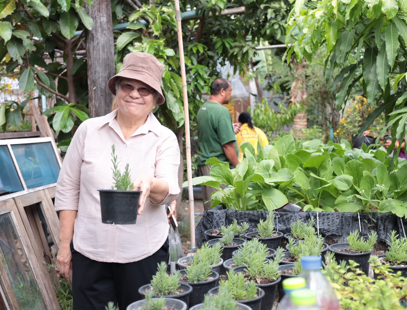นางสาวสมสุข บุญญะบัญชา ผู้ทรงคุณวุฒิ คณะกรรมการสถาบันพัฒนาองค์กรชุมชน กล่าวถึง ความสำคัญของการปลูกผักในชุมชนเมือง ไม่ใช่แค่เรื่องของการปลูกพืชผักเพื่อการบริโภคเท่านั้น แต่เป็นการสร้างรากฐานของการพึ่งพาตนเอง ลดรายจ่าย และเสริมสร้างความเข้มแข็งของชุมชน วันนี้เรามีแรงหนุนจากทั้ง สสส. และ พอช. อย่างเต็มที่ การปลูกผักอาจดูเหมือนเรื่องเล็ก แต่จริง ๆ แล้วมันสำคัญมาก เพราะนี่คือจุดเริ่มต้นของความมั่นคงทางอาหาร การปลูกผักไม่จำเป็นต้องใช้พื้นที่ขนาดใหญ่ สามารถทำได้ทุกที่ ไม่ว่าจะเป็นบริเวณบ้าน ในชุมชน ข้างทางรถไฟ หรือพื้นที่ว่างอื่น ๆ ที่สำคัญคือมันไม่มีสารเคมีตกค้าง เป็นอาหารที่ปลอดภัยสำหรับทุกคน การปลูกผักต้องกลายเป็นส่วนหนึ่งของวิถีชีวิต เป็นเรื่องปกติที่ทุกบ้านควรทำ และในอนาคต อาจกำหนดให้เป็นเงื่อนไขของโครงการบ้านมั่นคง เช่น ทุกครอบครัวต้องมีการปลูกพืชผักไว้บริโภคเอง และยังเป็นสื่อกลางในการเชื่อมโยงผู้คนในชุมชนให้เข้ามาร่วมกันปลูก แบ่งปัน และดูแลกันมากขึ้น