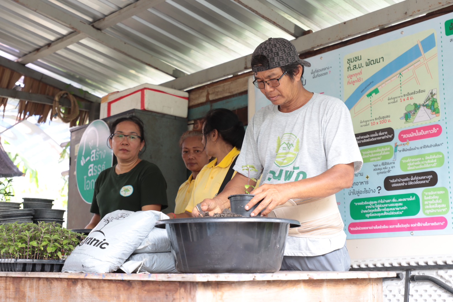 นางสาวปราณี ชาวสวนแพร ประธานบ้านมั่นคงชุมชน กสบ.พัฒนา ริมคลองลาดพร้าว เล่าถึง จุดเริ่มต้นของสวนผักในชุมชนว่า เดิมทีพื้นที่ส่วนกลางถูกวางแผนให้เป็นสวนสาธารณะสำหรับออกกำลังกายและเป็นที่พักผ่อนของคนในชุมชน แต่เนื่องจากงบประมาณมีจำกัด จึงต้องหาทางเลือกใหม่ กระทั่งได้รับคำแนะนำจากเจ้าหน้าที่ พอช. ให้เข้าร่วมโครงการ “สวนผักคนเมือง” และสามารถขอรับทุนสนับสนุนเพื่อพัฒนาพื้นที่ให้เป็นแปลงผักชุมชน พื้นที่สีเขียวของชุมชนแห่งนี้ ไม่เพียงช่วยลดค่าใช้จ่ายด้านอาหารให้กับสมาชิก แต่ยังทำให้ชุมชนมีพื้นที่สำหรับทำกิจกรรมร่วมกัน การทำสวนยังช่วยฟื้นฟูความสัมพันธ์ในชุมชน จากที่เคยมีความขัดแย้งในช่วงการก่อสร้างบ้านมั่นคง กลับกลายเป็นพื้นที่ที่สร้างปฏิสัมพันธ์ที่ดีขึ้น นอกจากจะปลูกผักไว้บริโภคในครัวเรือนแล้ว ชุมชนยังต่อยอดไปสู่การขายผลผลิต เช่น การเพาะต้นกล้าขาย หรือแม้แต่รับจ้างจัดกระเช้าผักเพื่อสุขภาพ ซึ่งทำให้สมาชิกมีรายได้เสริม โดยยังคงยึดหลักการทำเกษตรอินทรีย์ที่ปลอดภัยต่อสุขภาพ พื้นที่สีเขียวในชุมชนไม่ใช่แค่เรื่องของอาหาร แต่เป็นการสร้างความยั่งยืนทั้งในมิติสิ่งแวดล้อมและสังคม สวนผักชุมชนจึงเป็นหนึ่งในแนวทางที่ช่วยเปลี่ยนเมืองให้เป็นพื้นที่ที่น่าอยู่ และเป็นโมเดลที่สามารถขยายผลไปยังพื้นที่อื่น ๆ ได้ในอนาคต