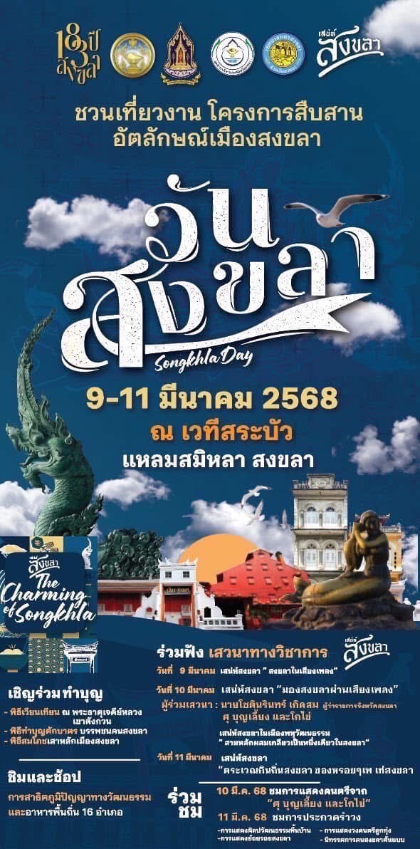 เชิญชวนชาวสงขลา และ จังหวัดใกล้เคียง เที่ยวงานสืบสานอัตลักษณ์เมืองสงขลา “วันสงขลา” 9 – 11 มีนาคม 2568 ณ เวทีสระบัว แหลมสมิหลาสงขลา พร้อมร่วมสัมผัส เสน่ห์สงขลา แดนดินถิ่นสงขลา ครบจบในงานเดียว…