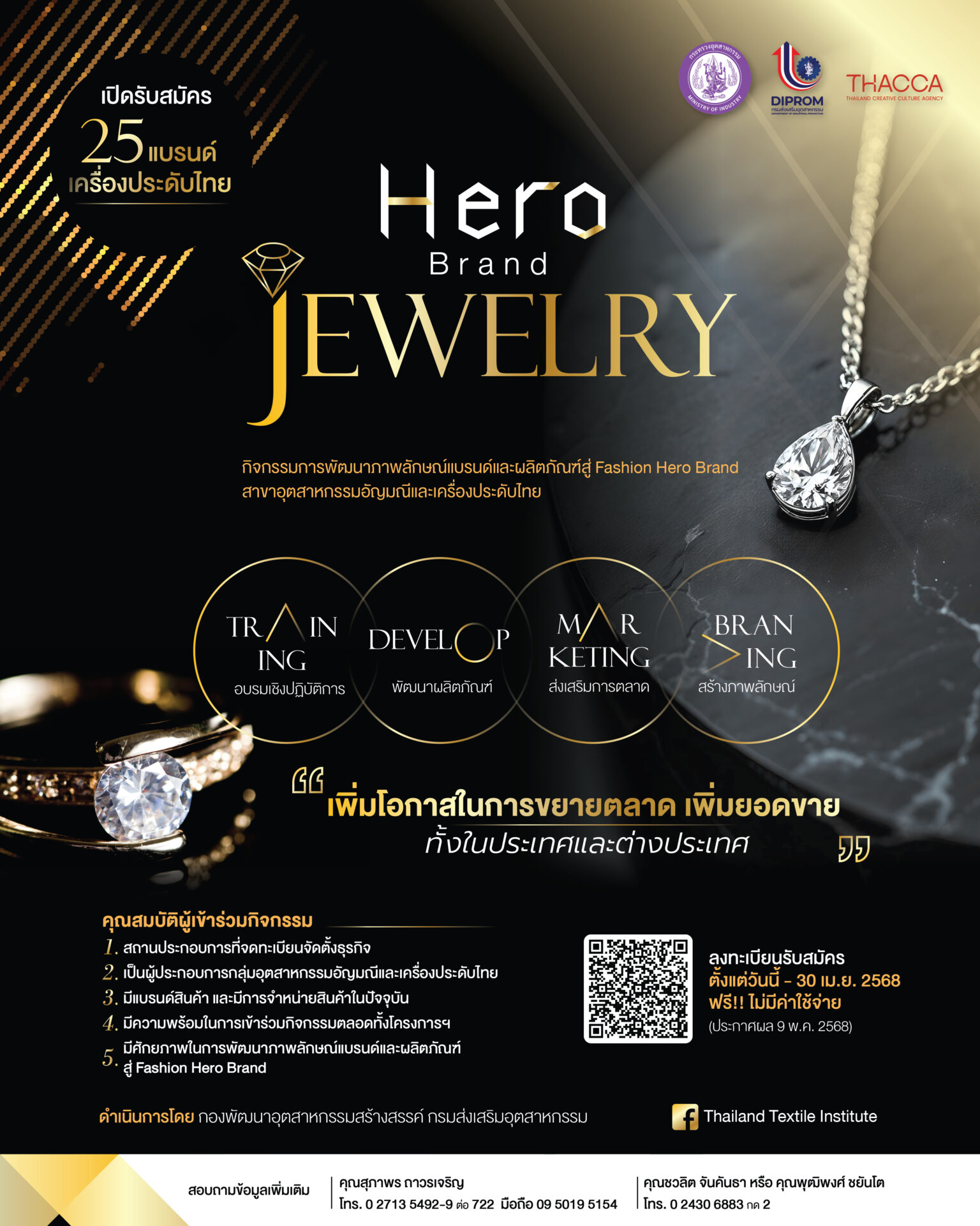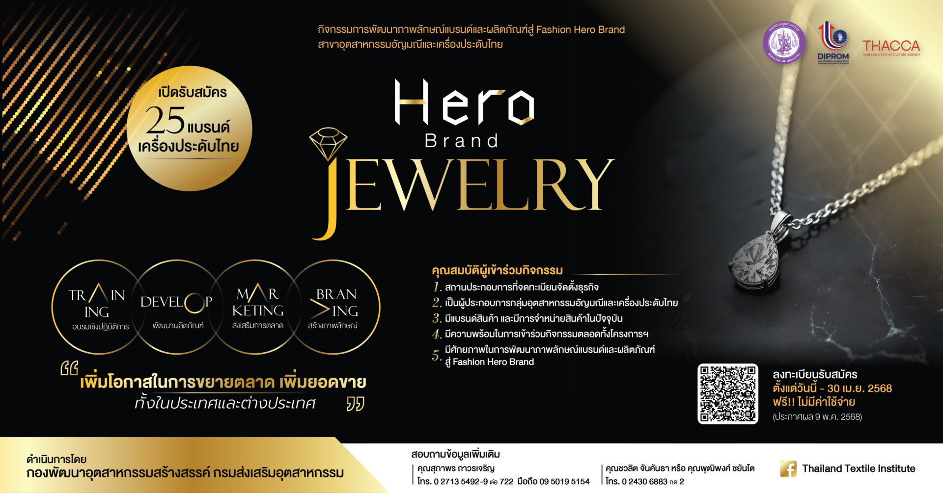 สอบถามข้อมูลเพิ่มเติมเกี่ยวกับโครงการ "HERO BRAND JEWELRY" ได้ที่ คุณสุภาพร ถาวรเจริญ โทร.02-713-5492-9 ต่อ 722 มือถือ 095-019-5154 และคุณชวลิต จันคันธา หรือ คุณพุฒิพงศ์ ชยันโต โทร. 02-430-6883 กด 2.