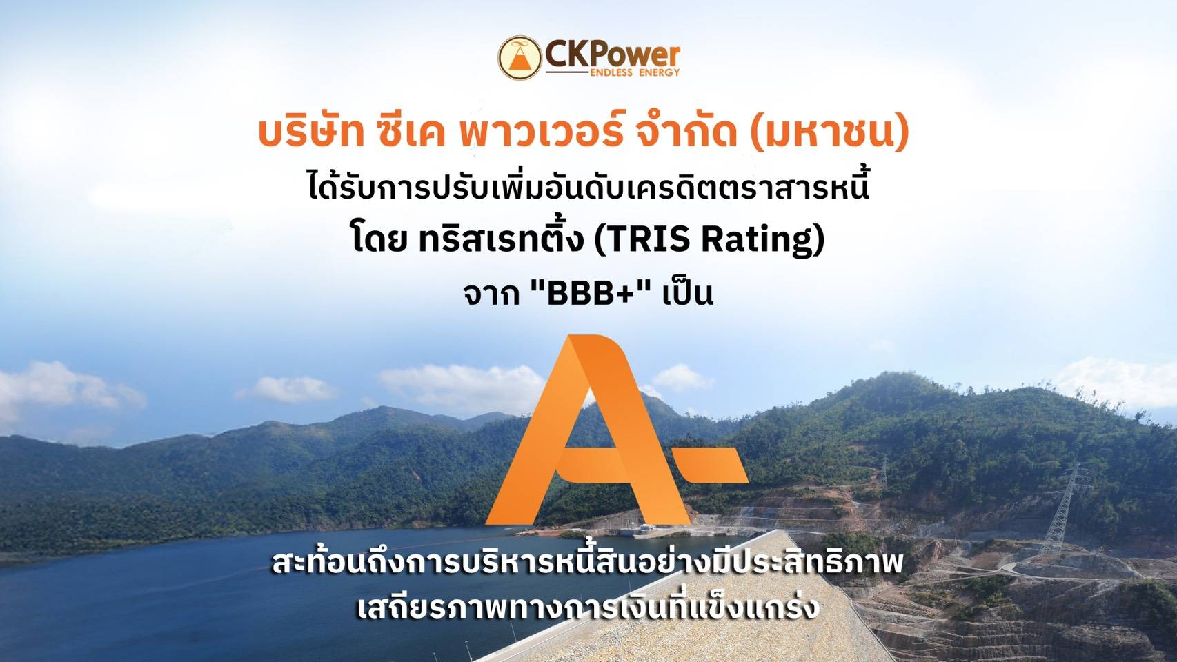 กรุงเทพฯ 8 เม.ย. 2568 – นายธนวัฒน์ ตรีวิศวเวทย์ กรรมการผู้จัดการ บริษัท ซีเค พาวเวอร์ จำกัด (มหาชน) หรือ CKPower (ชื่อย่อหลักทรัพย์: CKP) หนึ่งในผู้นำในการผลิตไฟฟ้าจากพลังงานหมุนเวียนที่ใหญ่ที่สุดในภูมิภาคและมีคาร์บอนฟุตพรินต์ที่ต่ำที่สุดรายหนึ่ง เปิดเผยว่า บริษัท ซีเค พาวเวอร์ จำกัด (มหาชน) หรือ CKPower ได้รับการปรับเพิ่มอันดับเครดิตตราสารหนี้ (Issue Rating) จาก "BBB+" เป็น "A-" จากบริษัท ทริสเรทติ้ง จำกัด (ทริสเรทติ้ง) เมื่อวันที่ 31 มีนาคม 2568 พร้อมคงอันดับเครดิตองค์กร (Company Rating) ที่ระดับ "A-" และแนวโน้มอันดับเครดิต “คงที่” โดยอันดับเครดิตที่ปรับสูงขึ้นนี้สะท้อนถึงโครงสร้างหนี้ที่แข็งแกร่งขึ้น จากการบริหารหนี้สินอย่างมีประสิทธิภาพ การทยอยลดภาระหนี้ของบริษัทย่อย และการรักษาระดับความสามารถในการชำระหนี้ให้อยู่ในเกณฑ์แข็งแกร่ง ส่งผลให้ภาพรวมทางการเงินของบริษัทมีเสถียรภาพมากยิ่งขึ้น