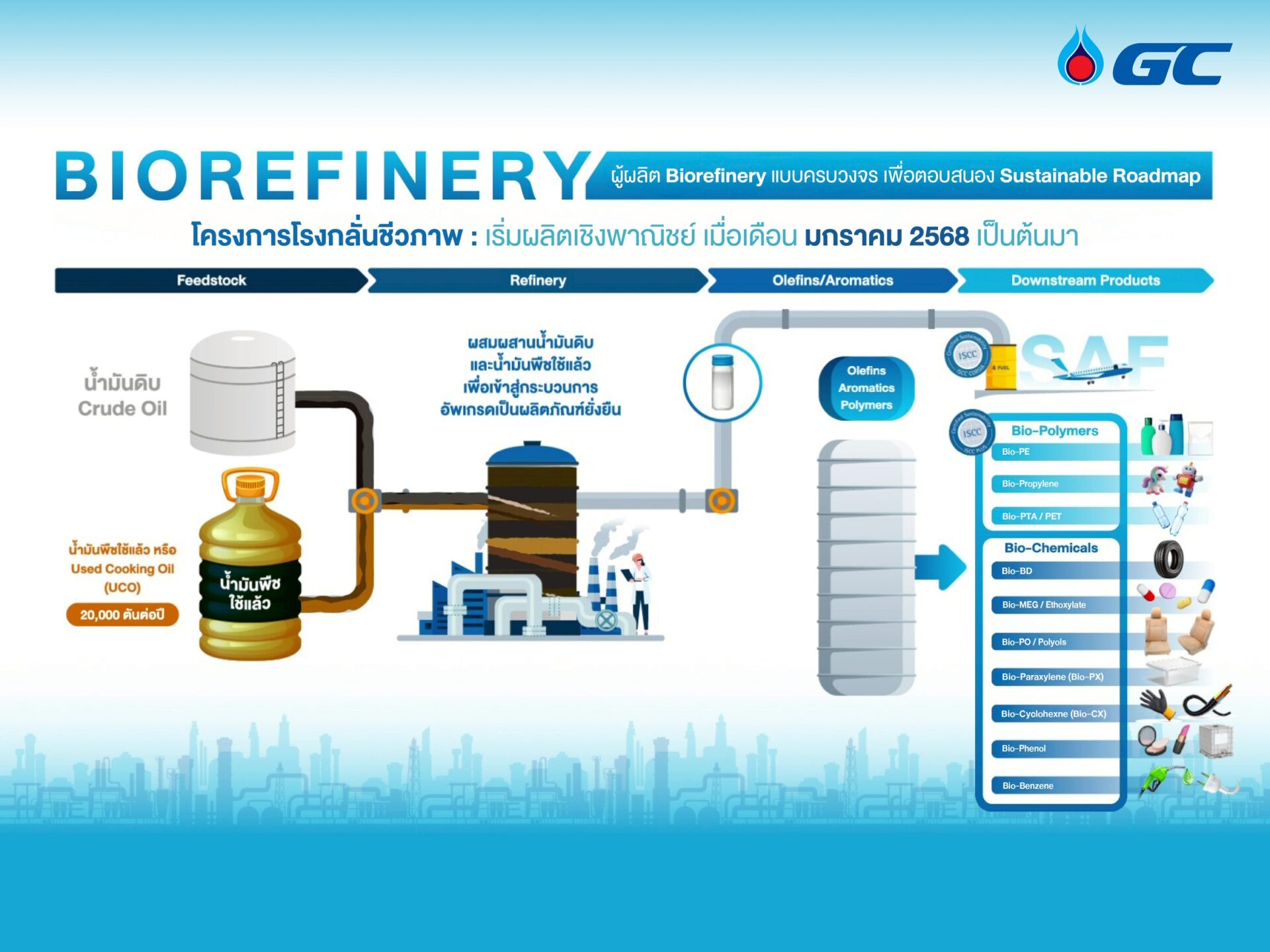 นอกจากการผลิตเชื้อเพลิงอากาศยานแบบยั่งยืน (Sustainable Aviation Fuel: SAF) ที่มีกำลังการผลิตในเฟสแรก 6 ล้านลิตรต่อปีแล้ว GC ยังต่อยอดความเชี่ยวชาญด้านการกลั่นและเคมีภัณฑ์ขั้นสูง โดยการพัฒนากระบวนการ Co-processing ที่สามารถใช้งานร่วมกับหน่วยกลั่นเดิมได้ นำน้ำมันพืชใช้แล้ว (Used Cooking Oil: UCO) มาแปรรูปเป็นผลิตภัณฑ์เคมีชีวภาพ (Bio-Chemicals) และพลาสติกชีวภาพ (Bio-Polymers) มูลค่าสูง เพื่อตอบโจทย์ความต้องการของอุตสาหกรรมที่มุ่งเน้นการใช้วัสดุทางเลือกที่ยั่งยืนและเป็นมิตรต่อสิ่งแวดล้อม