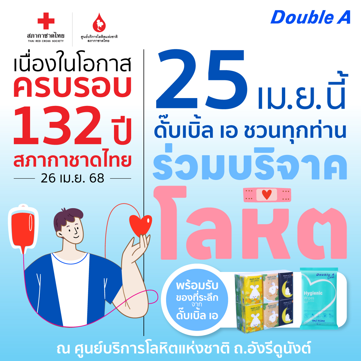 ดั๊บเบิ้ล เอ ขอเชิญชวนคนไทยรวมพลังทำความดี มาร่วมบริจาคโลหิต เพื่อช่วยเหลือผู้ป่วย และเป็นโลหิตสำรองให้เพียงพอต่อความต้องการ โดยในโอกาสพิเศษนี้! ทุกท่านที่ร่วมบริจาคโลหิต จะได้รับผลิตภัณฑ์ Double A Care เพียว&พรีเมียม ทิชชู แบบมินิพ็อกเกต และ ทิชชูเปียกแอลกอฮอล์
