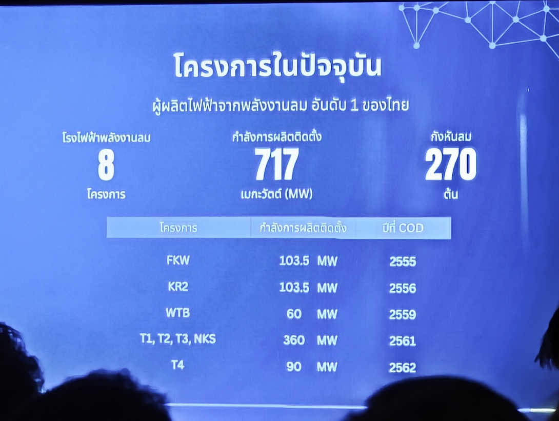 จากโรงไฟฟ้า 12 โครงการ แบ่งเป็น กลุ่มที่ COD แล้ว 717 เมกะวัตต์ จากโรงไฟฟ้าพลังงานลม 8 โครงการ และกลุ่มที่มีกำหนดวันจ่ายไฟฟ้าเข้าระบบเชิงพาณิชย์ที่ระบุในสัญญาซื้อขายไฟฟ้า (SCOD) ขนาดรวม 299 เมกะวัตต์ จาก 4 โครงการประกอบด้วย โรงไฟฟ้าพลังงานแสงอาทิตย์แบบมีระบบกักเก็บพลังงานติดตั้งบนพื้นดิน 1 โครงการ และพลังงานลม 3โครงการ