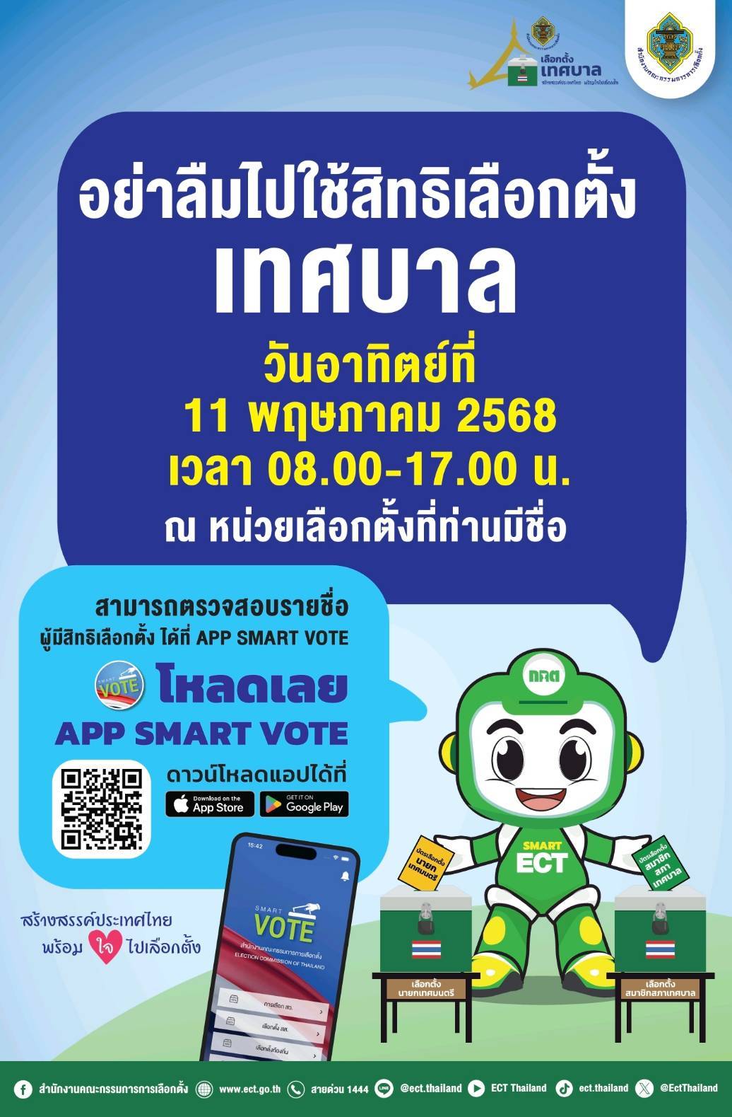 สำนักงานคณะกรรมการการเลือกตั้งขอเชิญชวนผู้มีสิทธิเลือกตั้งออกมาใช้สิทธิเลือกตั้งเทศบาล ในวันอาทิตย์ที่ 11 พฤษภาคม 2568 ตั้งแต่เวลา 08:00 - 17:00 น. ณ หน่วยเลือกตั้งที่ท่านมีชื่อ ทั้งนี้การออกมาใช้สิทธิเลือกตั้งเป็นหน้าที่สำคัญในการส่งเสริมประชาธิปไตย และมีส่วนร่วมในการกำหนดอนาคตของชุมชนท้องถิ่นของเรา