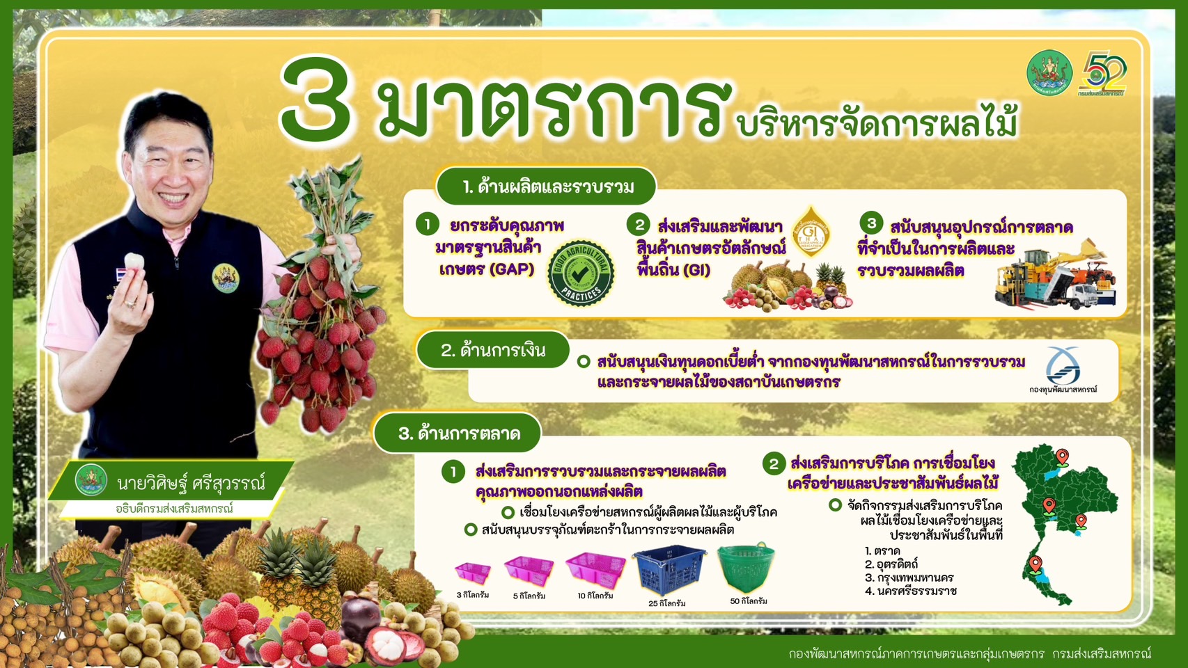 ภายใต้นโยบายของ ศ.ดร.นฤมล ภิญโญสินวัฒน์ รัฐมนตรีว่าการกระทรวงเกษตรและสหกรณ์ ได้เน้นย้ำความสำคัญในการยกระดับการทำเกษตรแบบดั้งเดิมให้เข้าสู่เกษตรทันสมัย พร้อมทั้งกำหนดให้ส่งเสริมด้านการตลาดสินค้าเกษตร และการกระตุ้นผู้บริโภคผลไม้ไทยเป็นนโยบายเร่งด่วน โดยกรมกรมส่งเสริมสหกรณ์ได้ดำเนินการวางมาตรการบริหารจัดการผลไม้ของสถาบันเกษตรกร ออกเป็น 3 มาตรการ ดังนี้